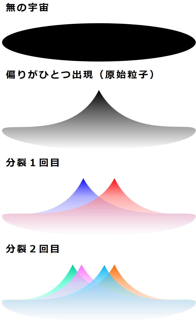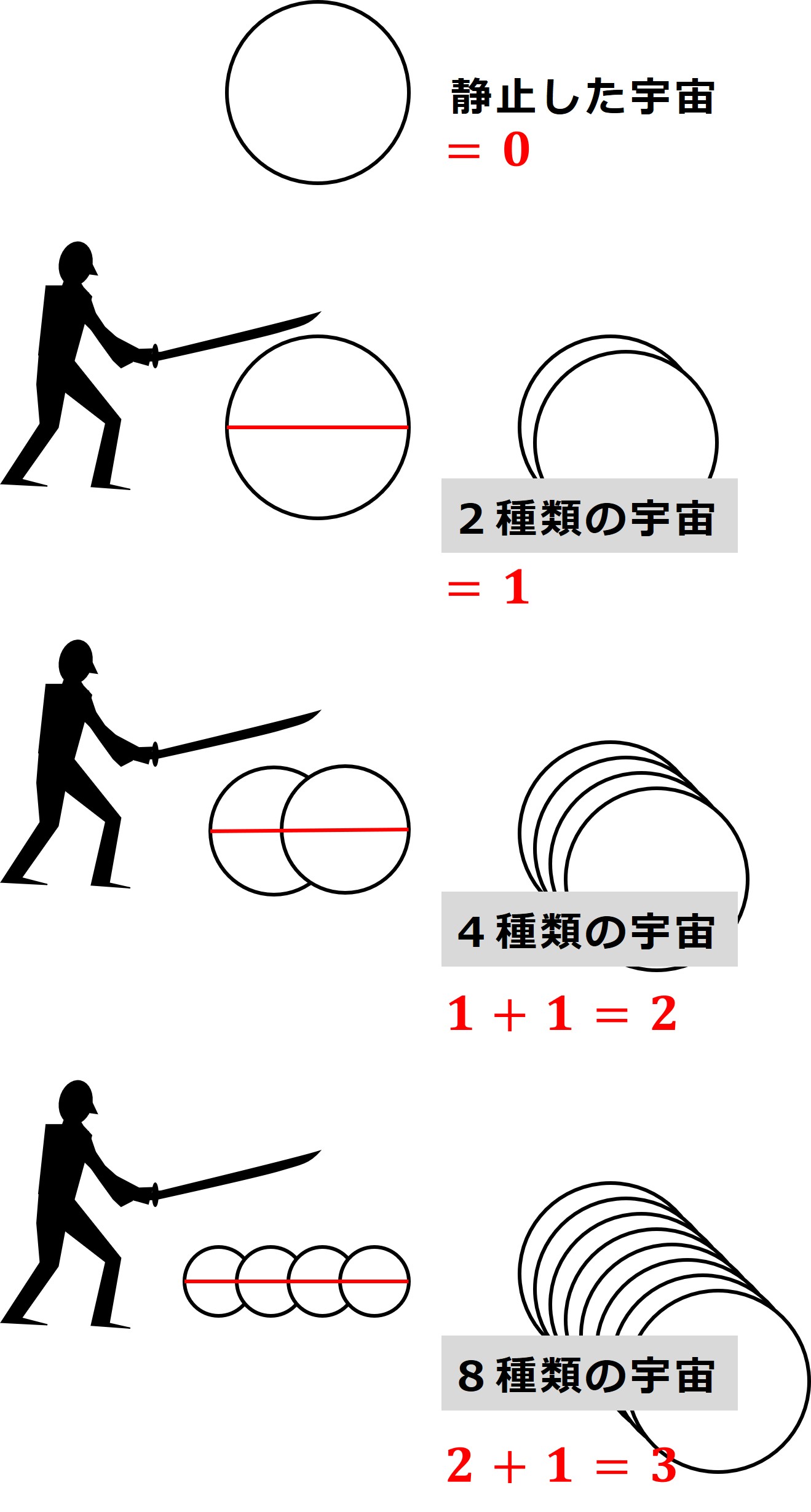 そこにまたサムライが近づき、2種類の宇宙を真っ二つに切り裂いたとします。宇宙が4つになりました。