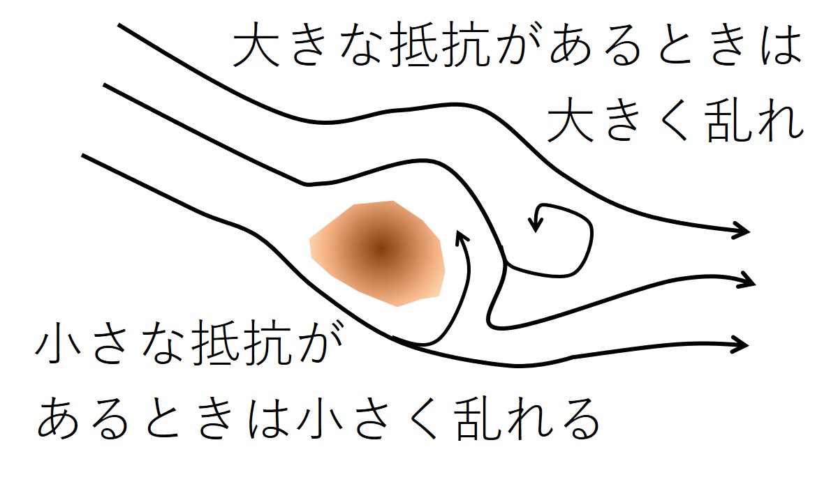 抵抗との摩擦により流れが乱れます(乱流の形成)。