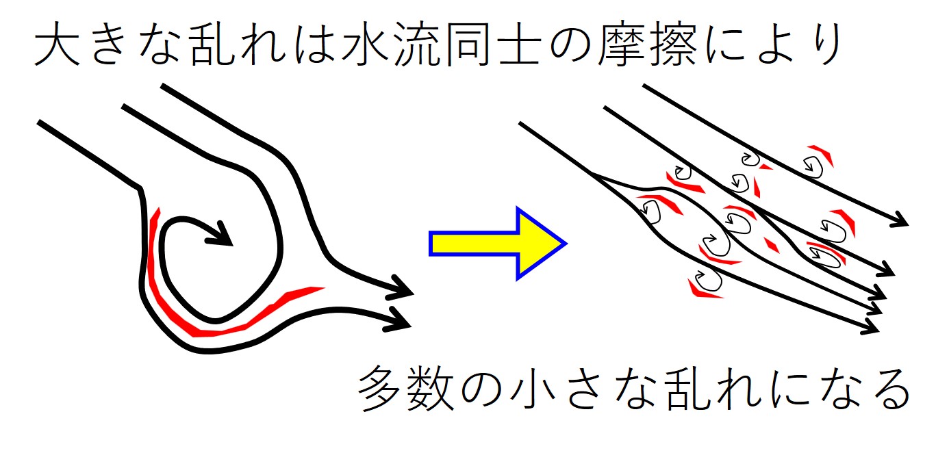 大きな抵抗で生じた大きな渦巻は、水流同士の摩擦により小さな乱れの集まりに散っていきます。