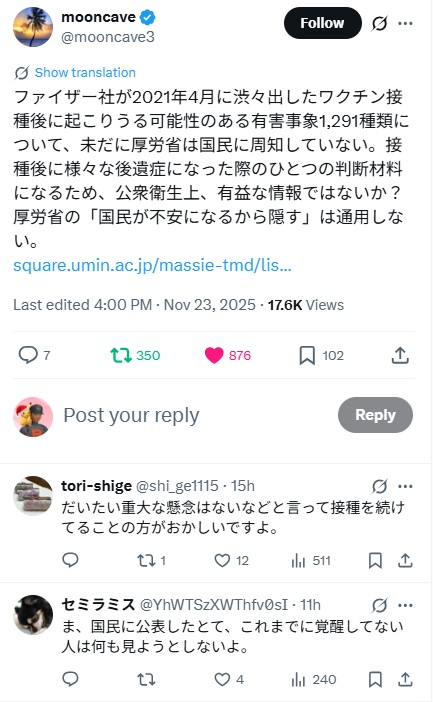 ファイザー社が2021年4月に渋々出したワクチン接種後に起こりうる可能性のある有害事象1,291種類について、未だに厚労省は国民に周知していない。接種後に様々な後遺症になった際のひとつの判断材料になるため、公衆衛生上、有益な情報ではないか?厚労省の「国民が不安になるから隠す」は通用しない。…