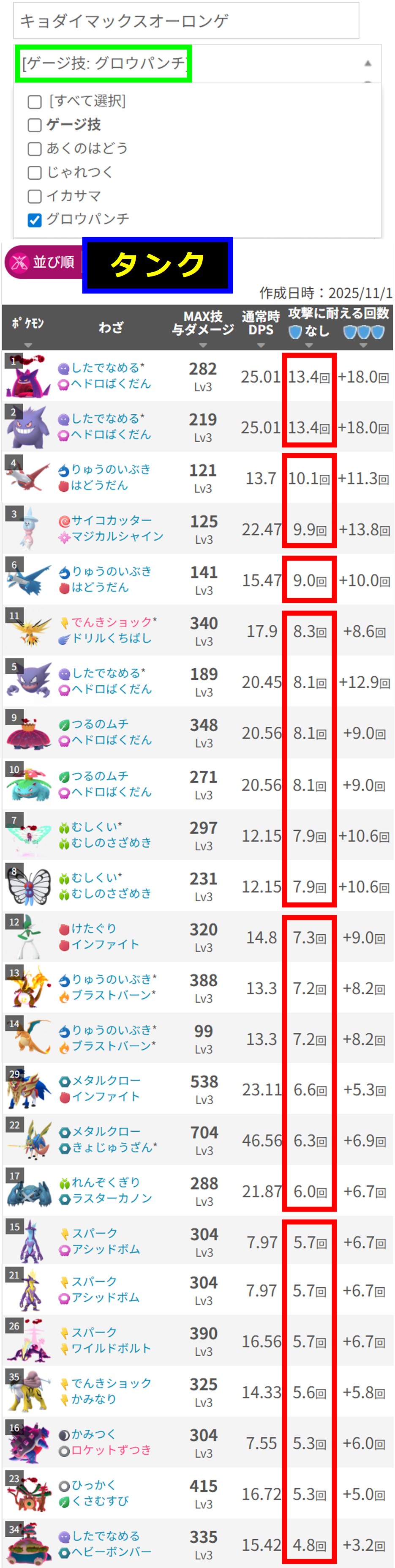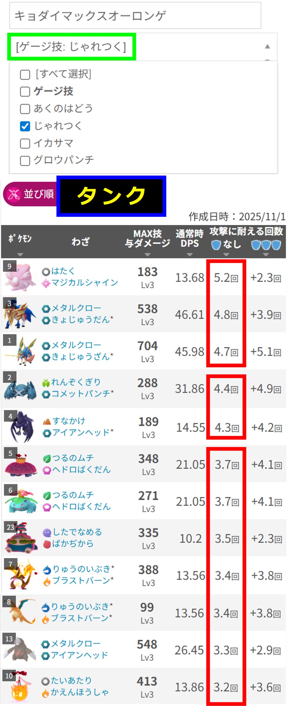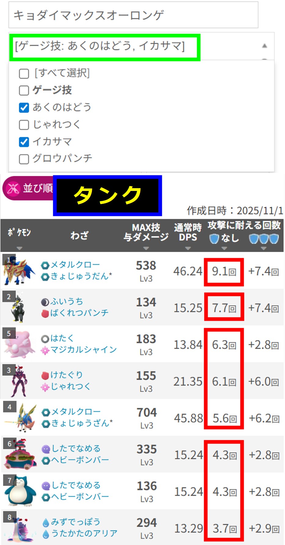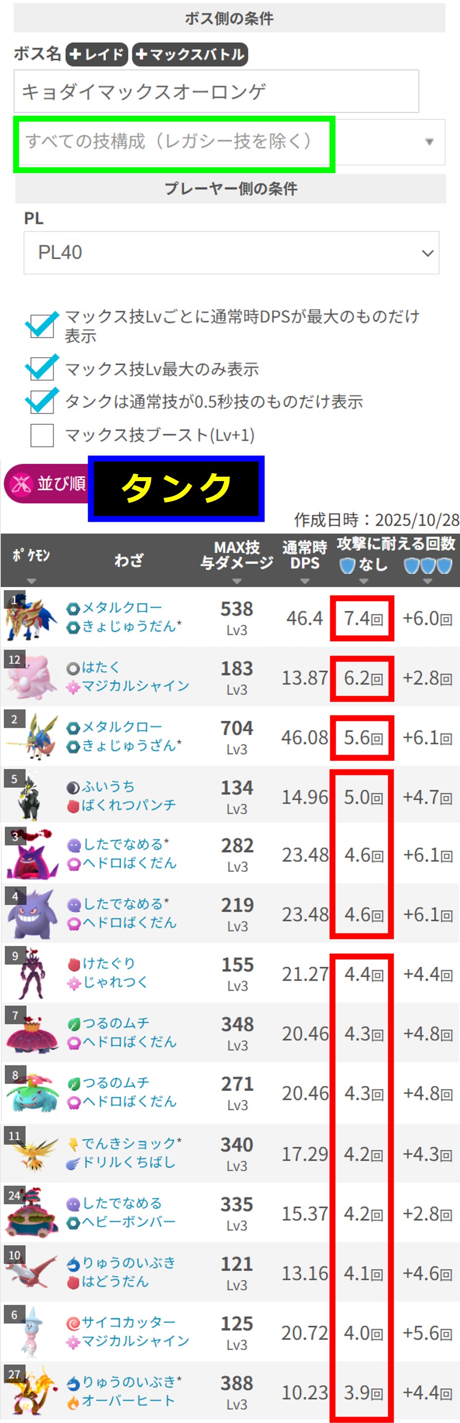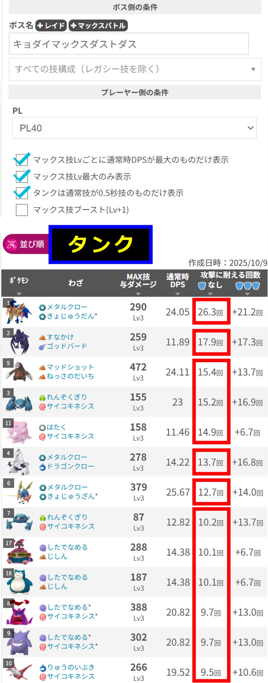 「みんポケ」さんの「マックスバトルタイプ別最強タンク一覧:▶ ▶ ▶」(2025.06.10)いくつか条件によっては最強が入れ替わりますので、記事で確認しましょう。