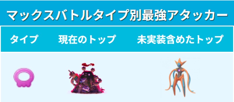 「みんポケ」さんの「マックスバトルタイプ別最強アタッカー一覧:▶ ▶ ▶」(2025.06.04)いくつか条件によっては最強が入れ替わりますので、記事で確認しましょう。