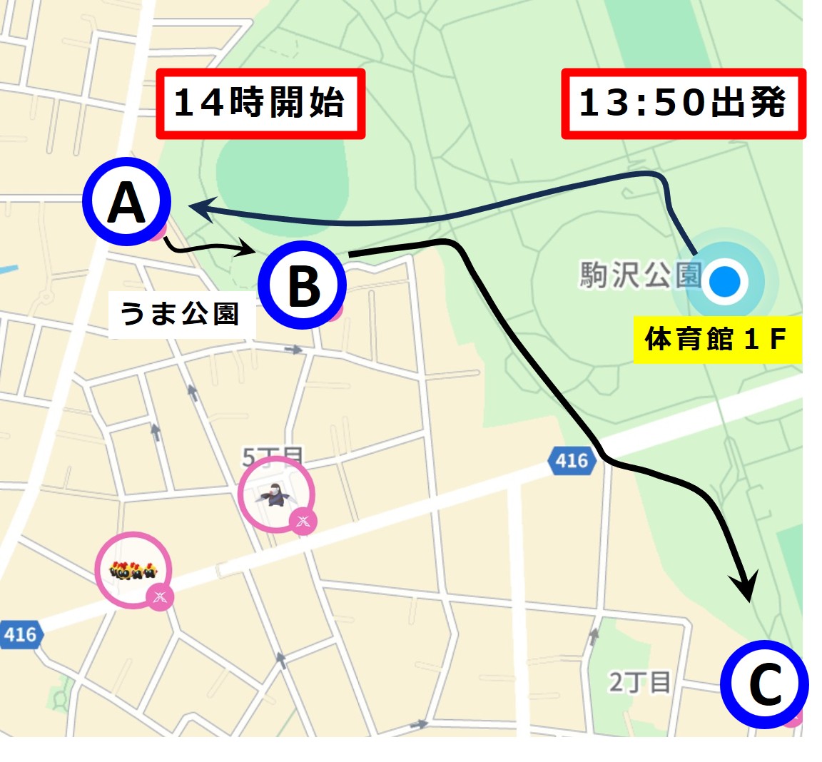体育館の工事が終わりましたので、駒沢公園のほぼ中央部にあり、雨天時もグループ分け等の調整が楽にできる体育館1階ロビーを集合場所とします。