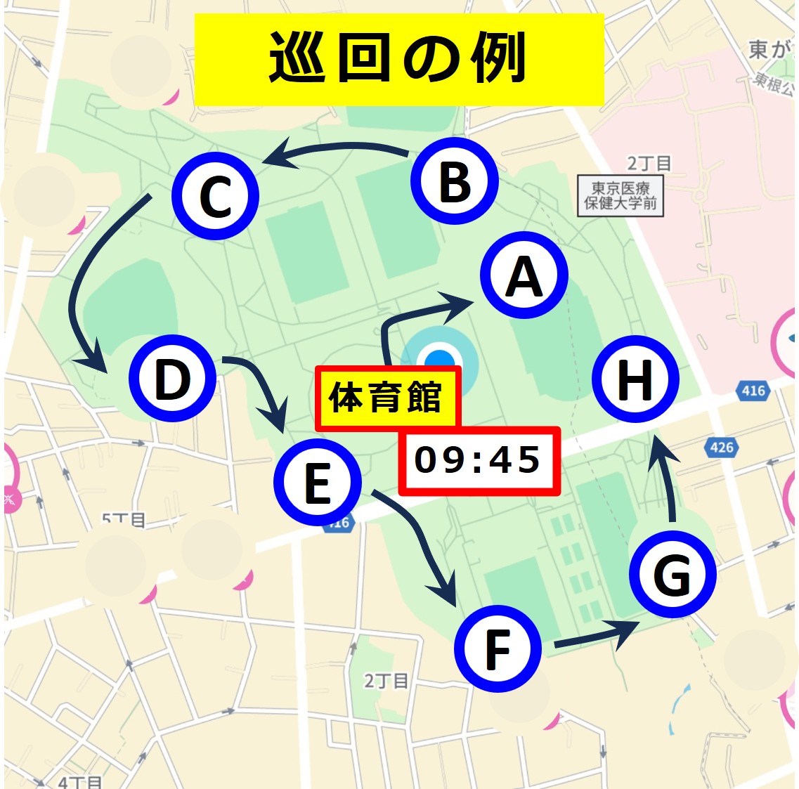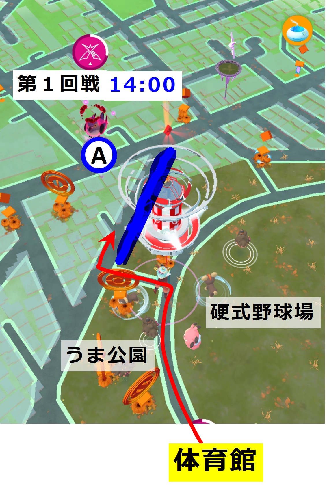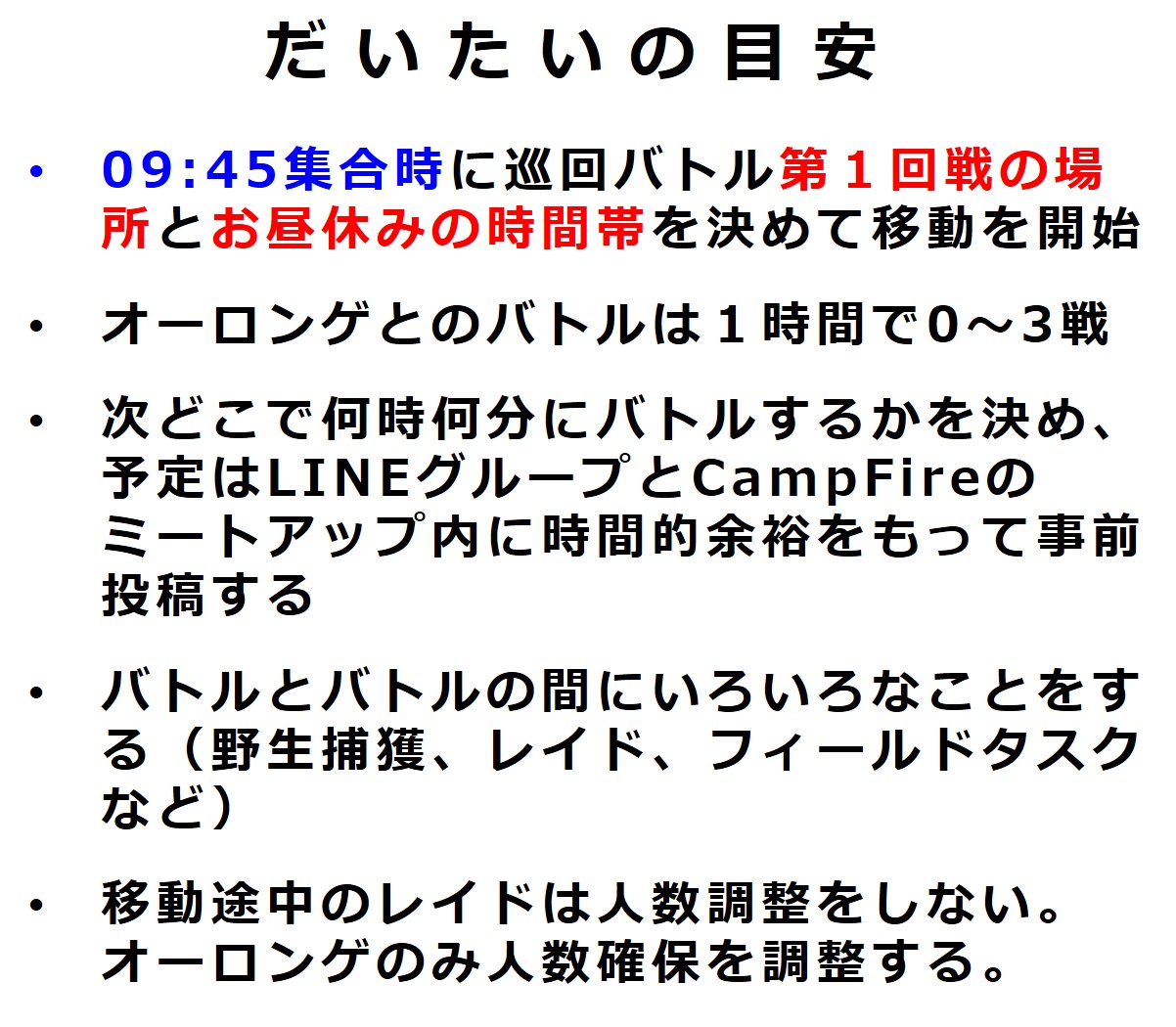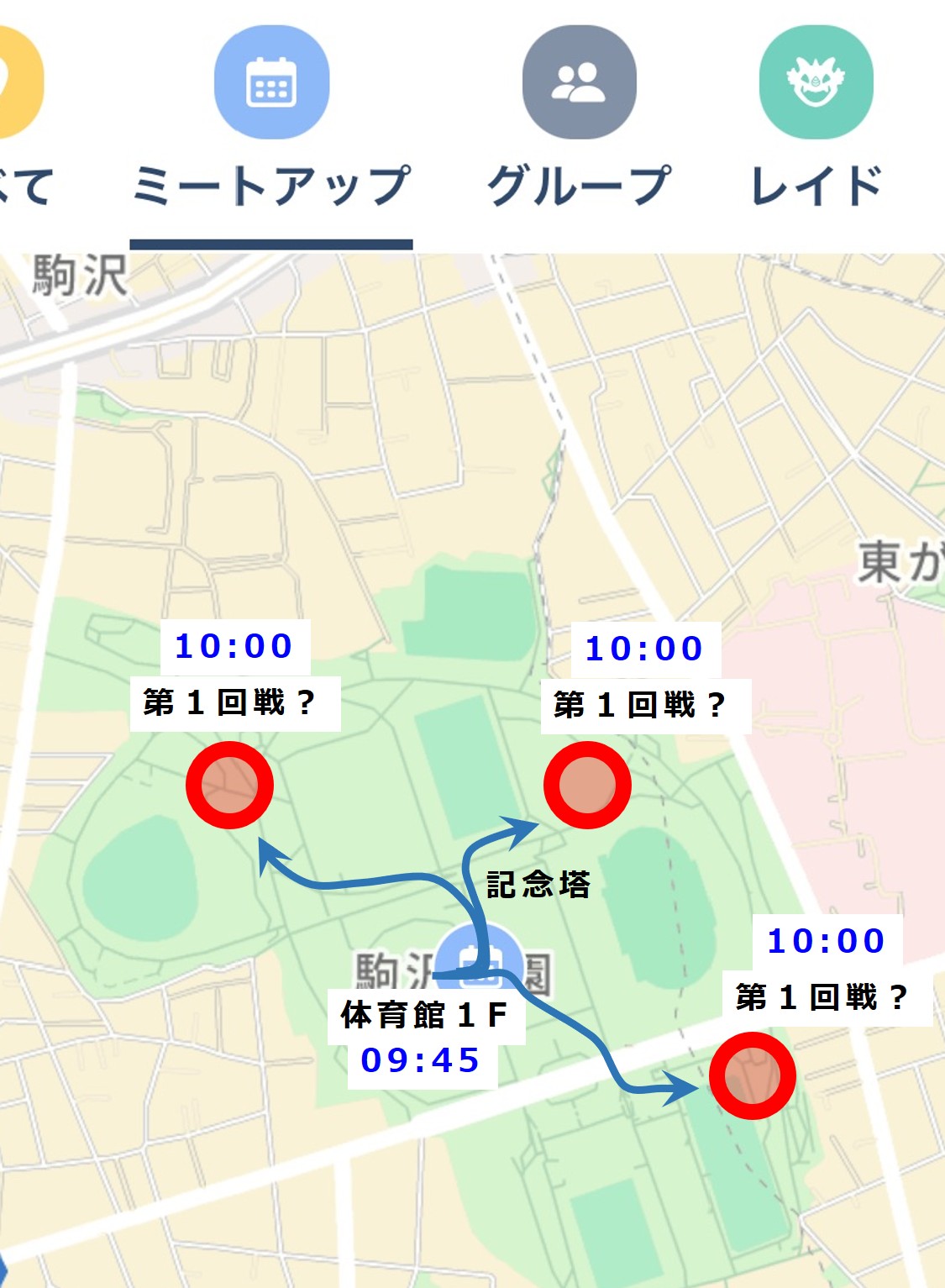 今後のキョダイマックスは、バトル開始 10 分前(グループ分けが必要になれば 15 分前)に体育館に集まり、最初にバトルする場所へ 10 分で移動するパターンを繰り返したいと考えています。