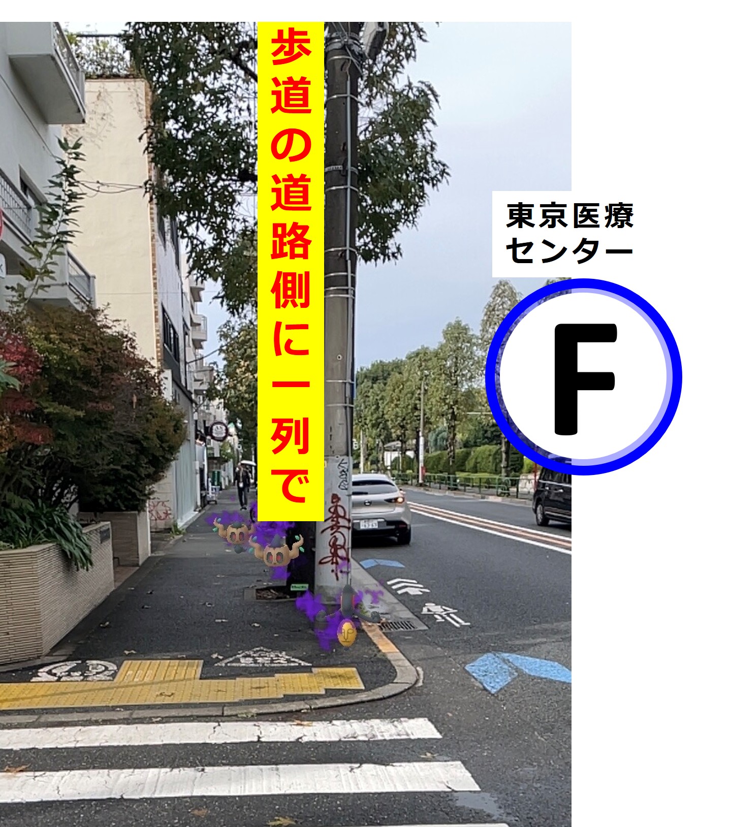 一部の方は駒沢通りに出ないと「F」にアクセスできません。必ず歩道上の道路側にならんで、通行の妨害にならないように注意してください。