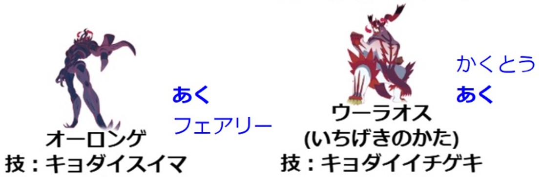 「あくタイプ」のMAXわざを使うキョダイマックスは「オーロンゲ」と「ウーラオス(いちげきのかた)」がいます。