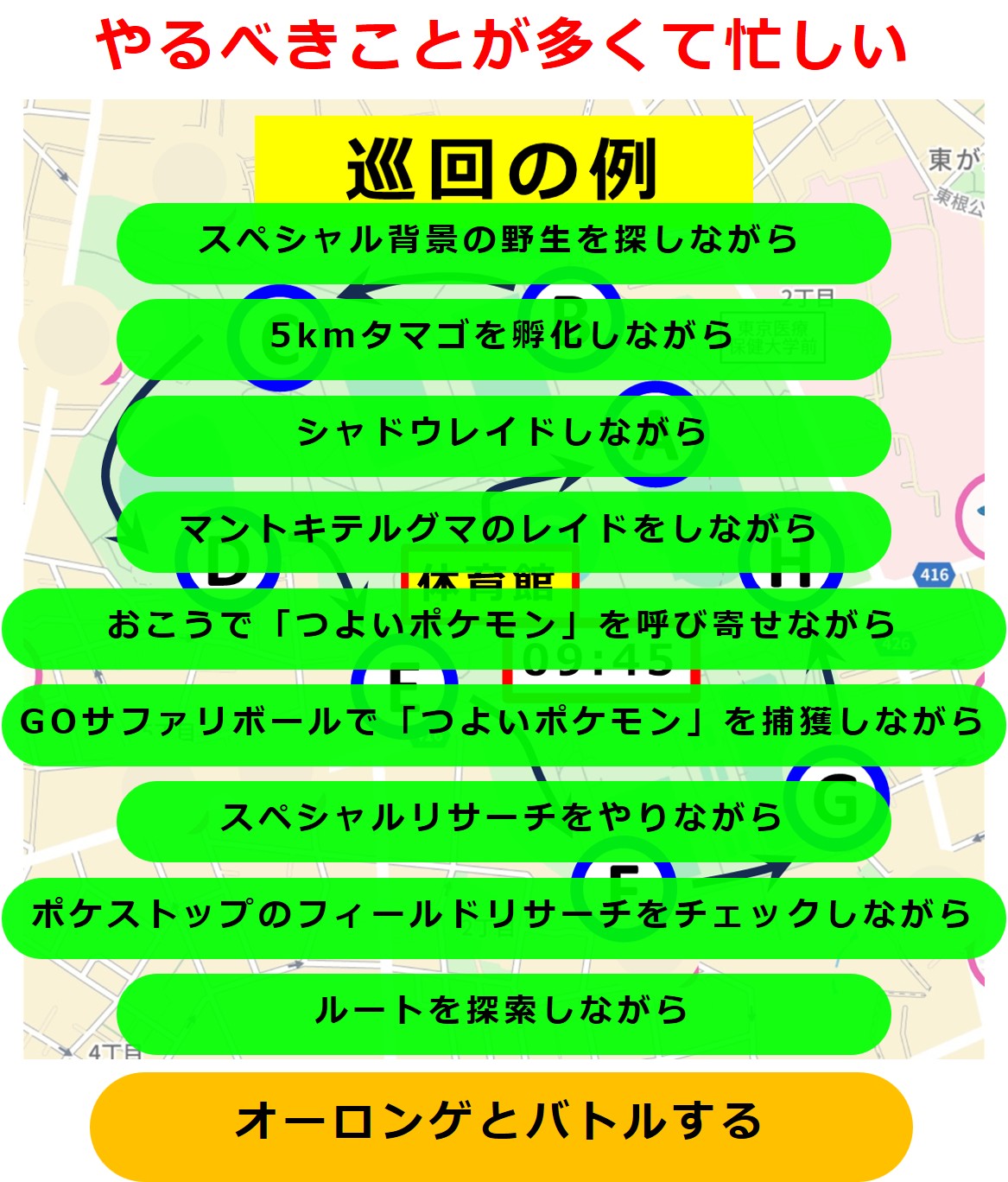 オーロンゲと次のオーロンゲとの間に、野生捕獲やレイドなどいろいろなことが出来るように計画します。