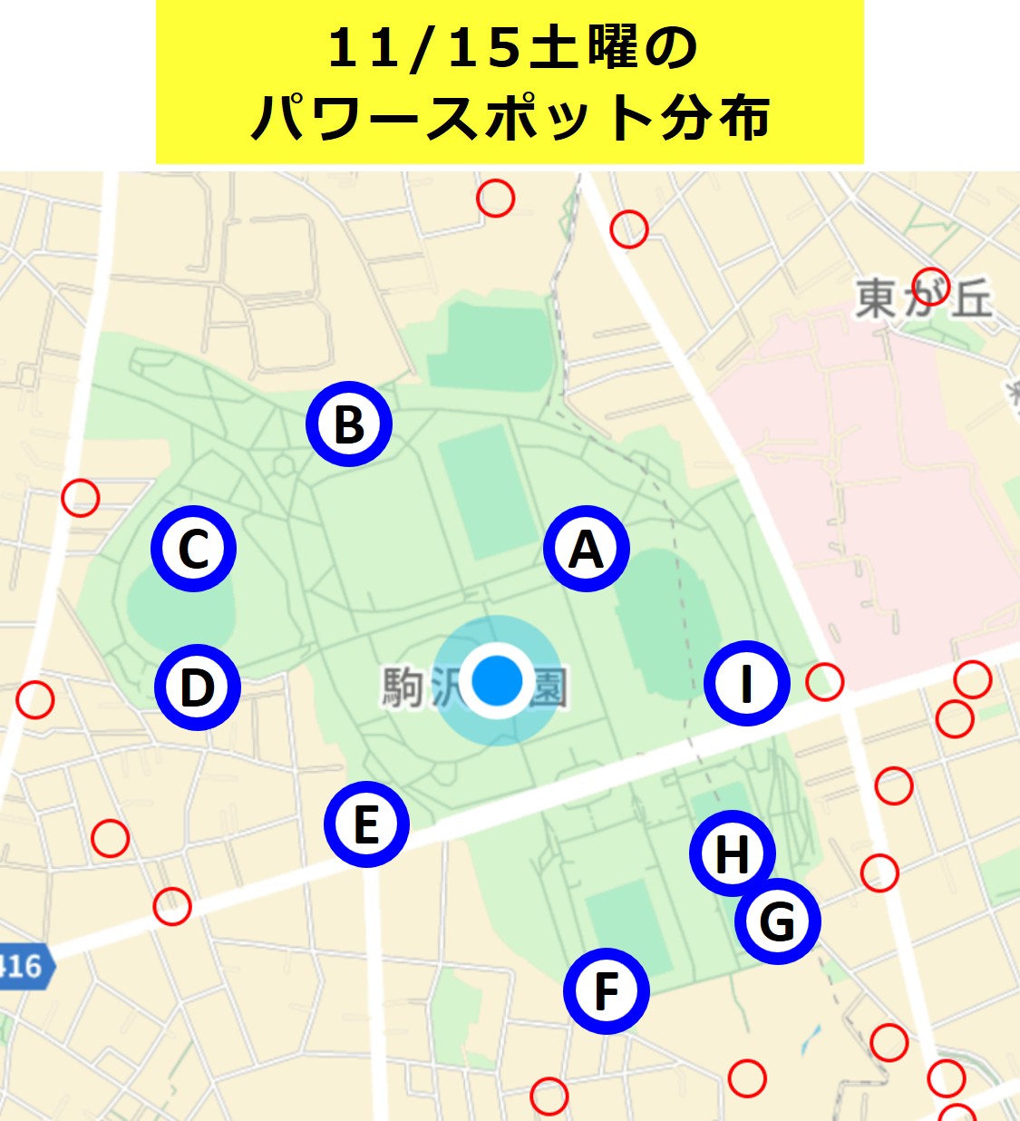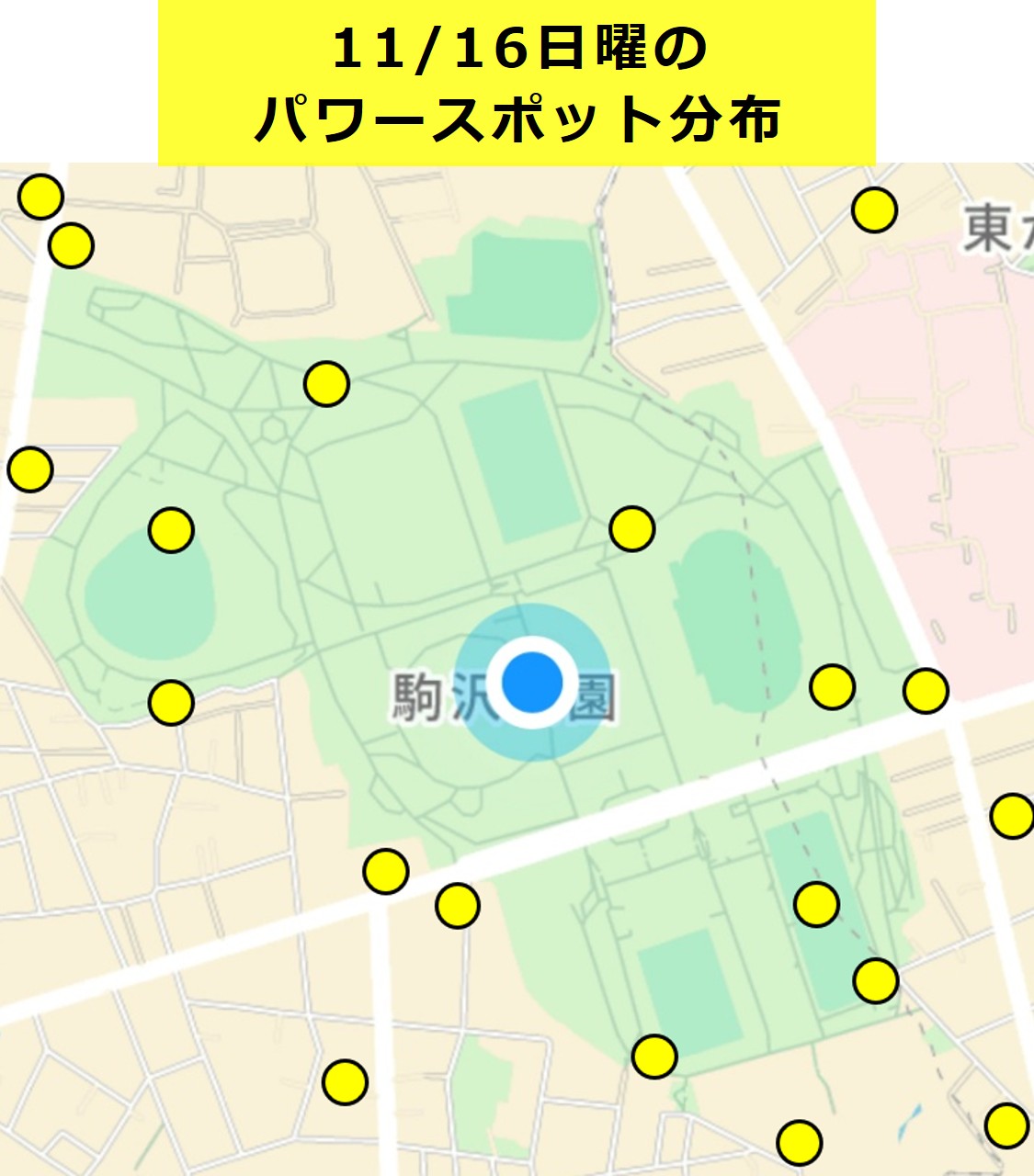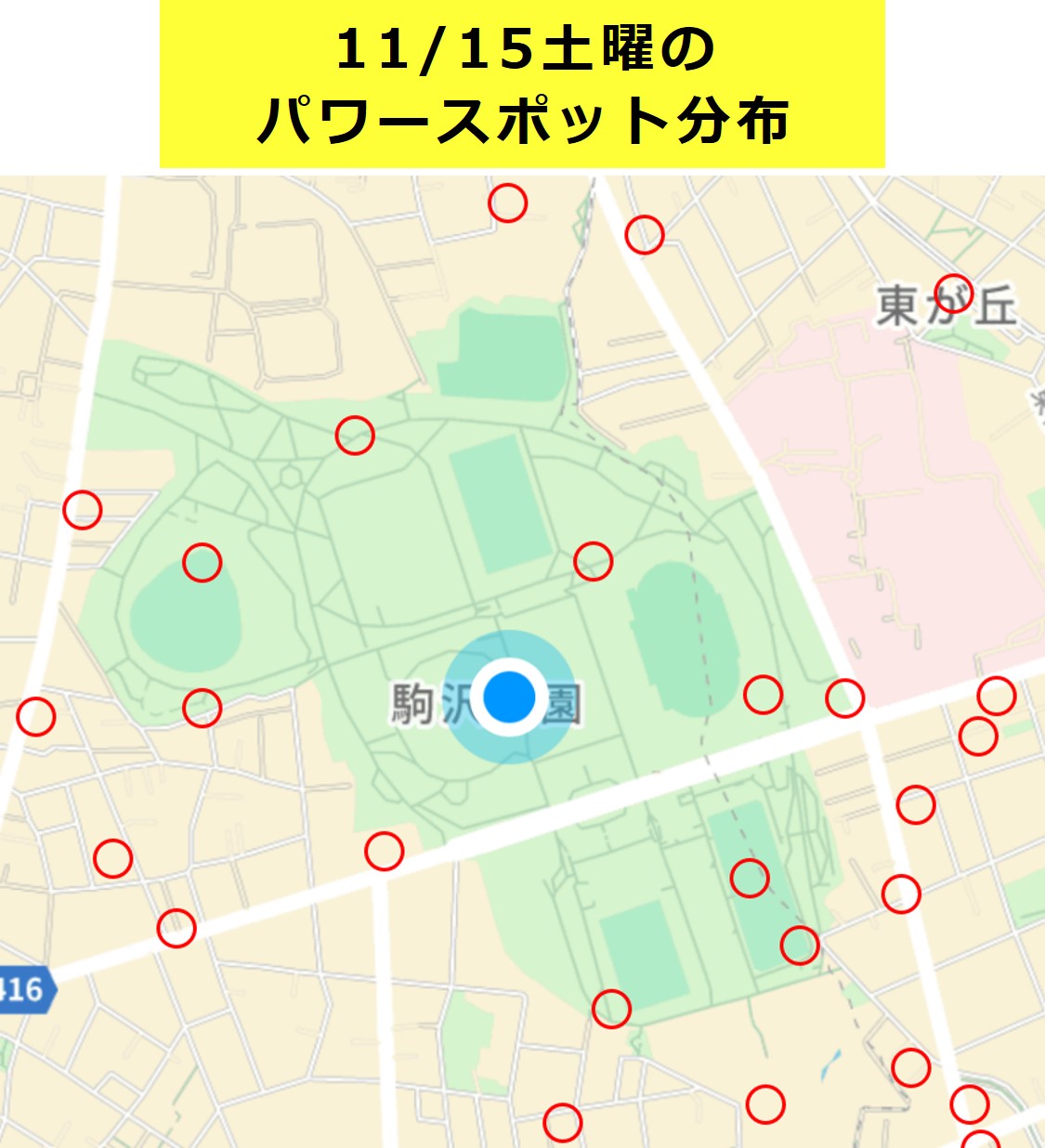 1日目(11/15土曜)と2日目(11/16日曜)とでは、「公園でのプレイヤー総数」が異なるので単純な比較はできませんが、inori729 さんのミートアップ・チェックイン人数は1日目が22人、2日目が15人であり、2日目が多いわけではないので、「待ち合わせ機能の利用によって参加人数の増えた部分」はそれなりに大きいと考えてよいでしょう。