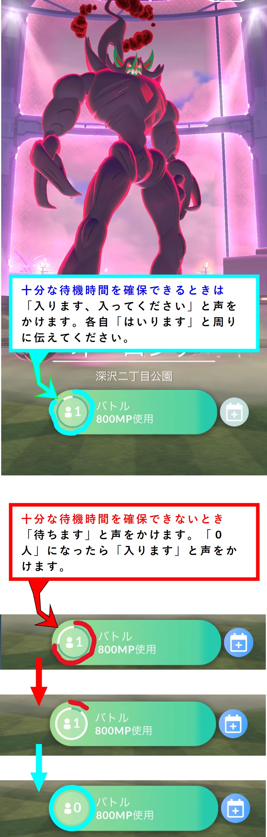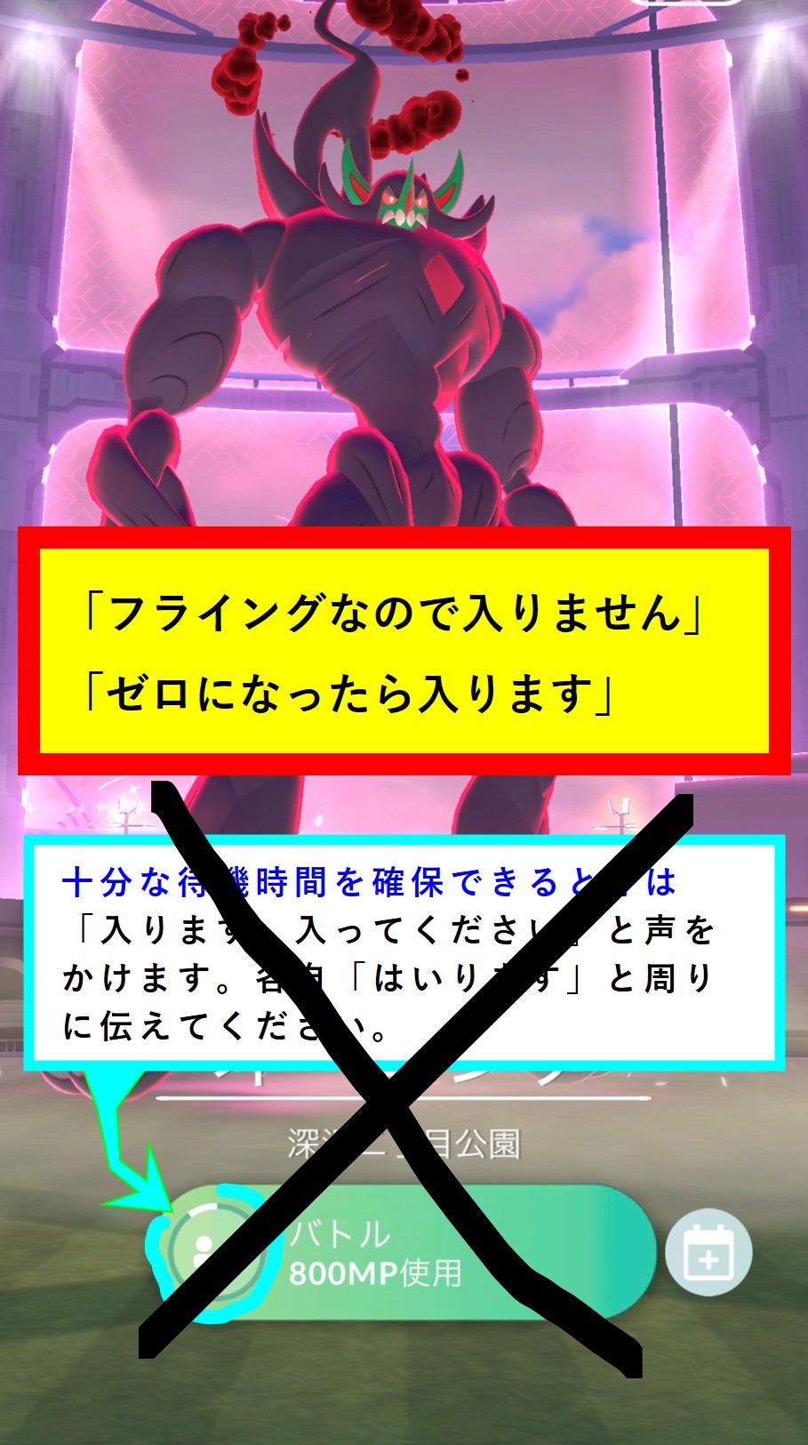 自制できない方もいるので難しいとは思いますが、パワースポットに先に到着しても、なるべくバトル待機画面に入らないようにお願いいたします。