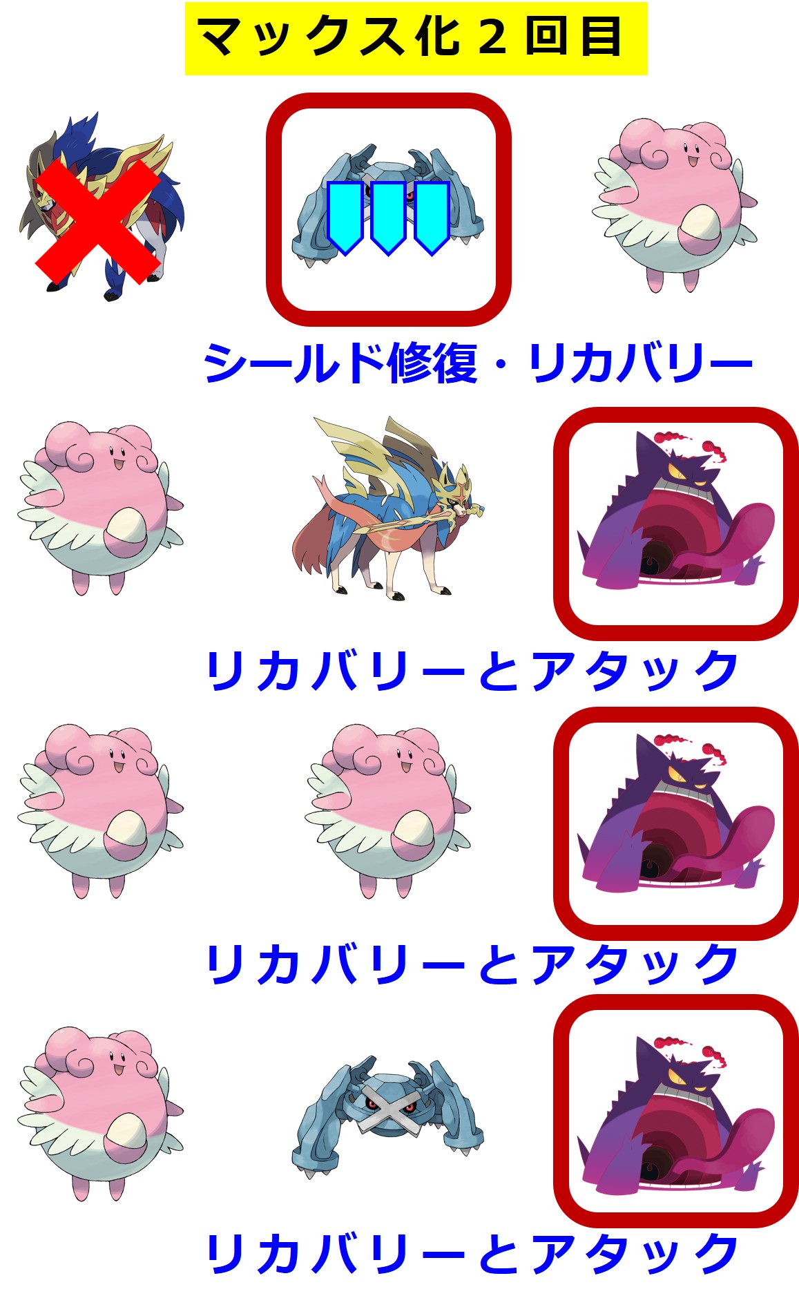 マックス技の強化レベルの低い人によるリカバリーは大きくありません。4人チーム全体で攻撃・防御・回復のバランスを考える必要があります。