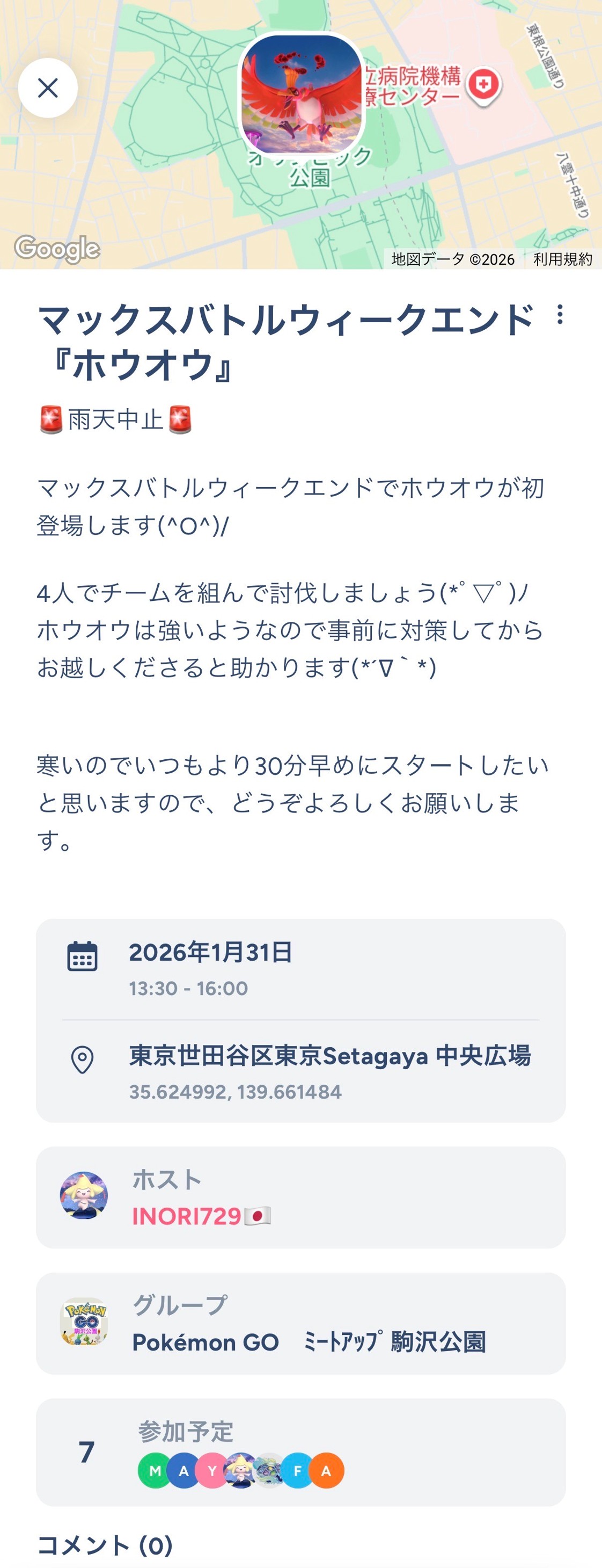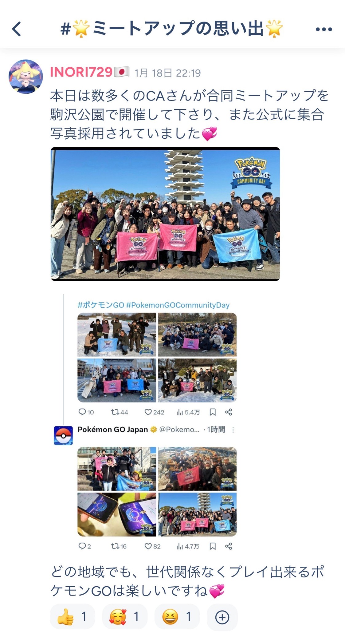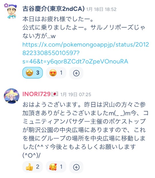 以下は、inori729 さんの「Pokémon GO ミートアップ 駒沢公園」グループ(現在参加者:約350名)の「#雑談どうぞ」と「#ミートアップの思い出」に投稿されたものです。