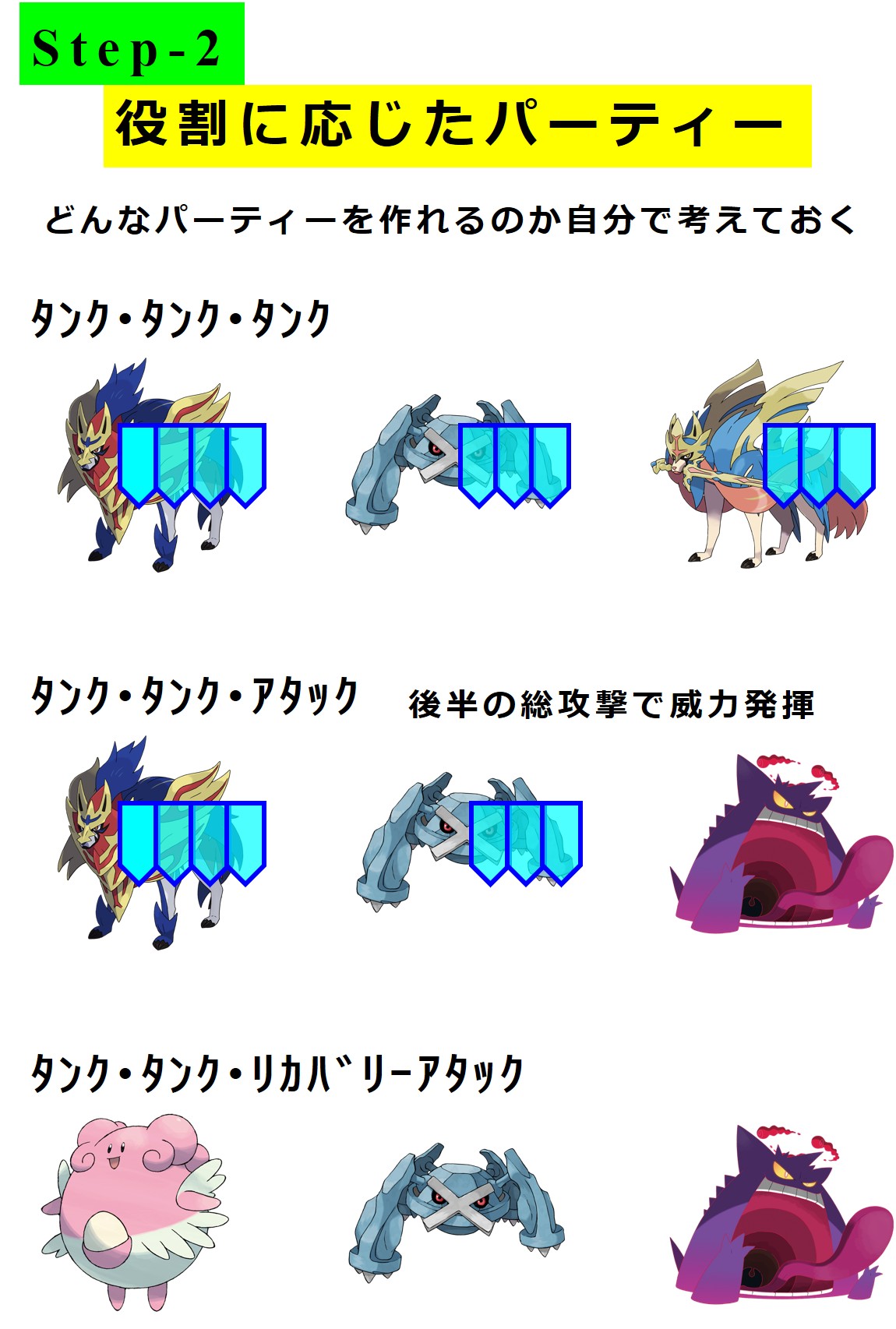 タンク役プレイヤーのタンクポケモンは、ボスから狙われるようにシールドを張ります。したがって、シールド3枚を張ったときの耐久性能の高いポケモンが優先されます。