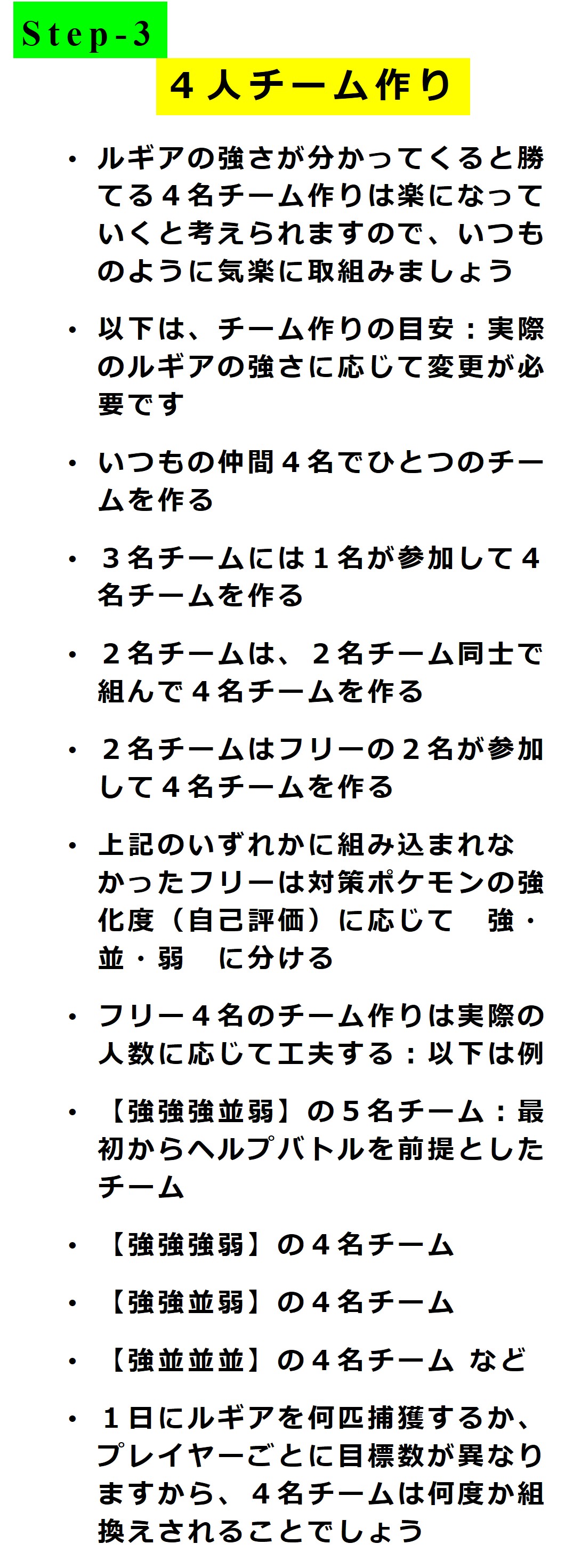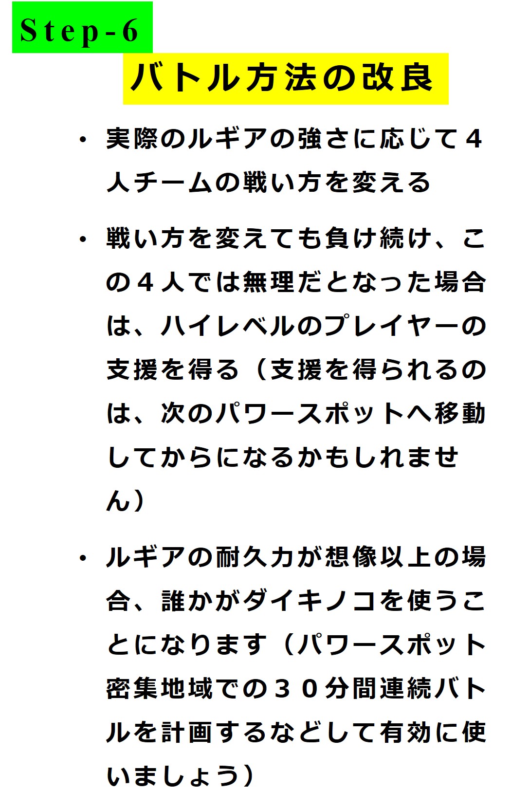 ルギア相手の場合、トレーナーレベル(TL)の低い人が都心に向かうことはあまりオススメできません。4人チームにTL低い人が混ざっているときは、強い人達が抜けてチームを作り直す「トレーナー・ガチャ」がおこなわれ、TL低い人はルギア打倒に苦労する可能性があります。特に人が多く集まりやすいところほど、すぐに4人チームを作れるので「トレーナー・ガチャ」は起こりやすくなります。TL低いプレイヤーは公園の集会を利用するのがよいでしょう。