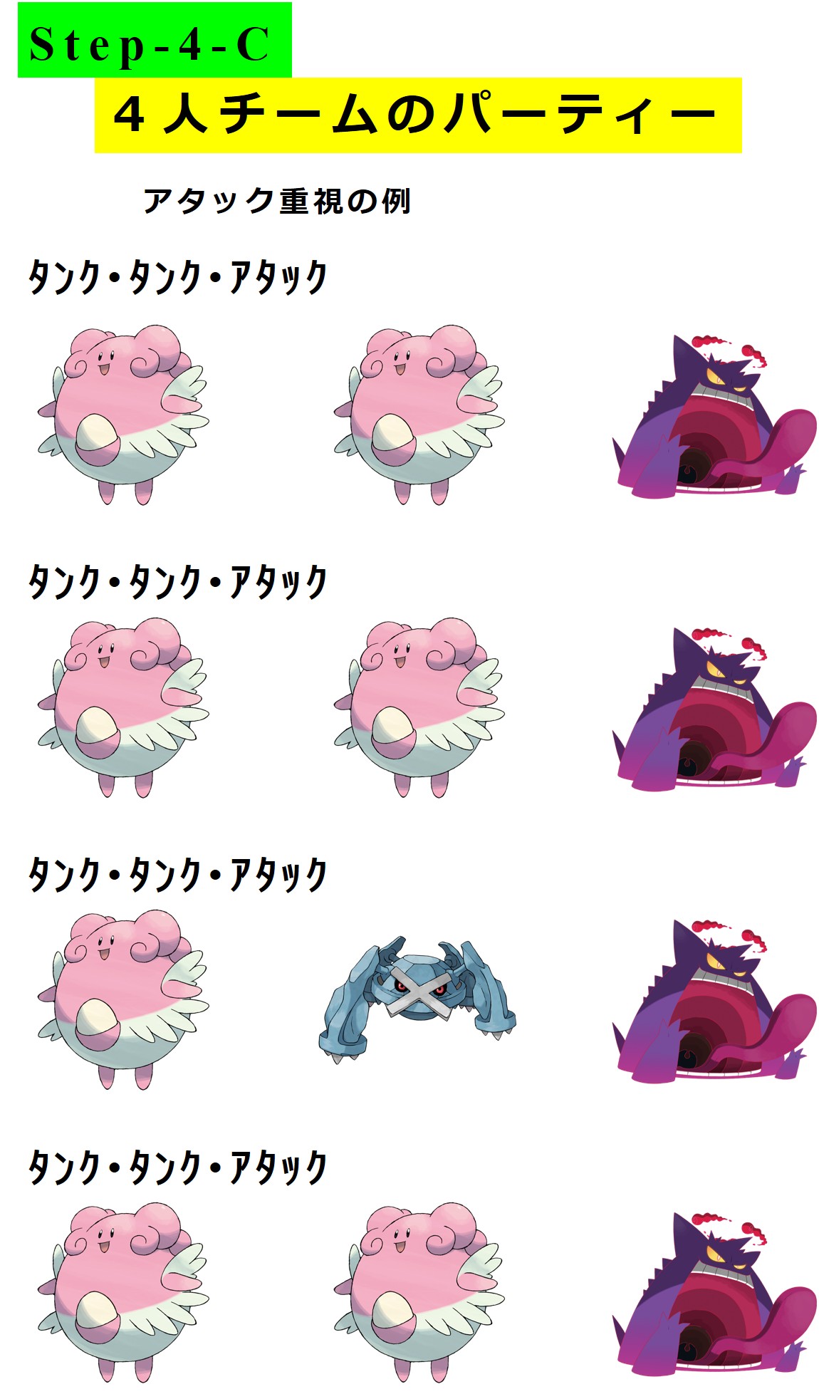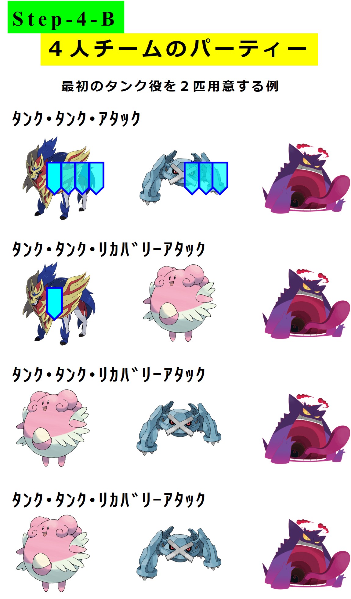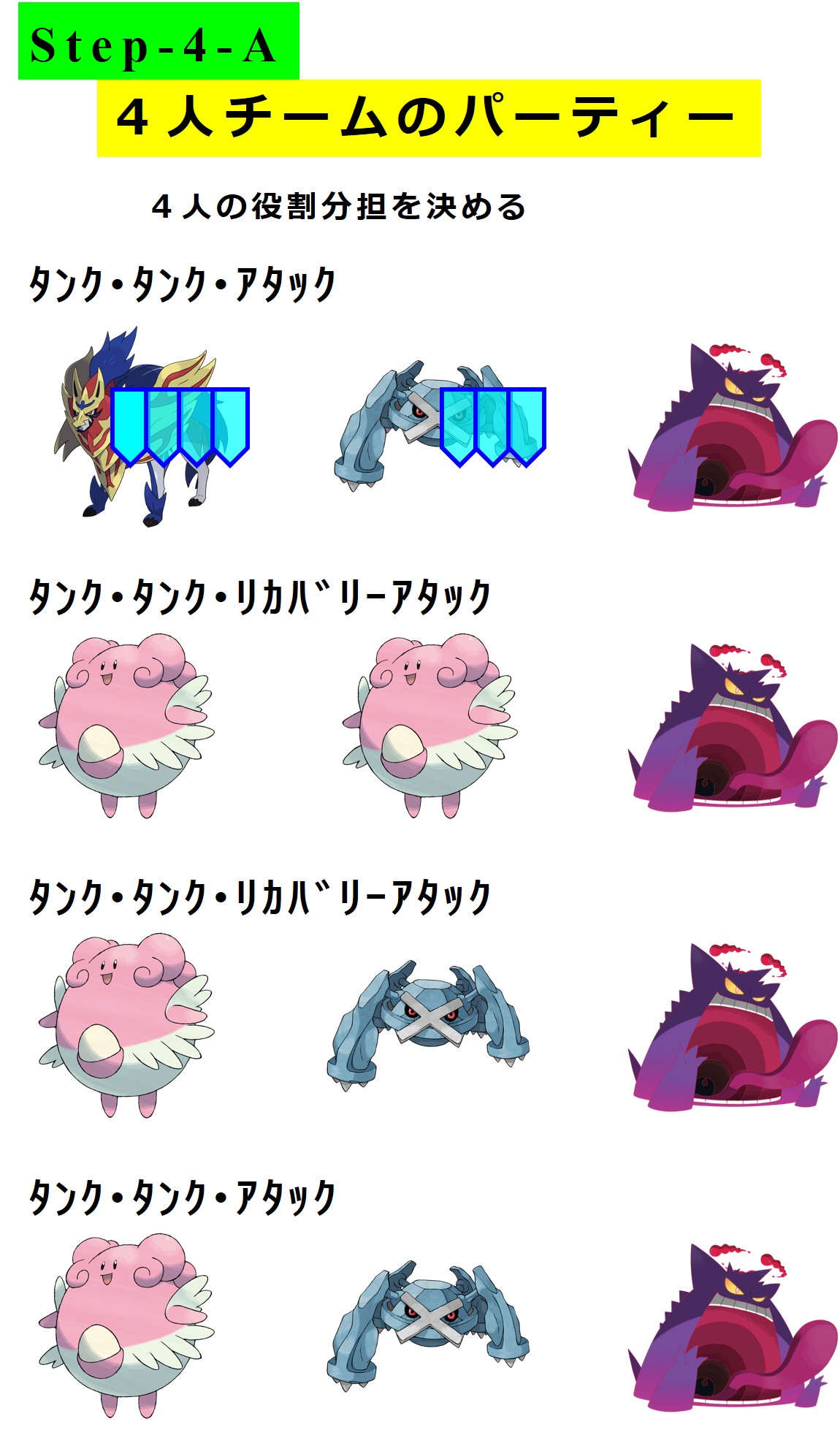 1度目の(キョ)ダイマックス化のとき、各自がどのポケモンをマックス化するのか、どのマックス技を使うのか(シールド?、リカバリー?、アタック?)、4名チーム内でしっかりと確認しあってからバトルを開始しましょう。