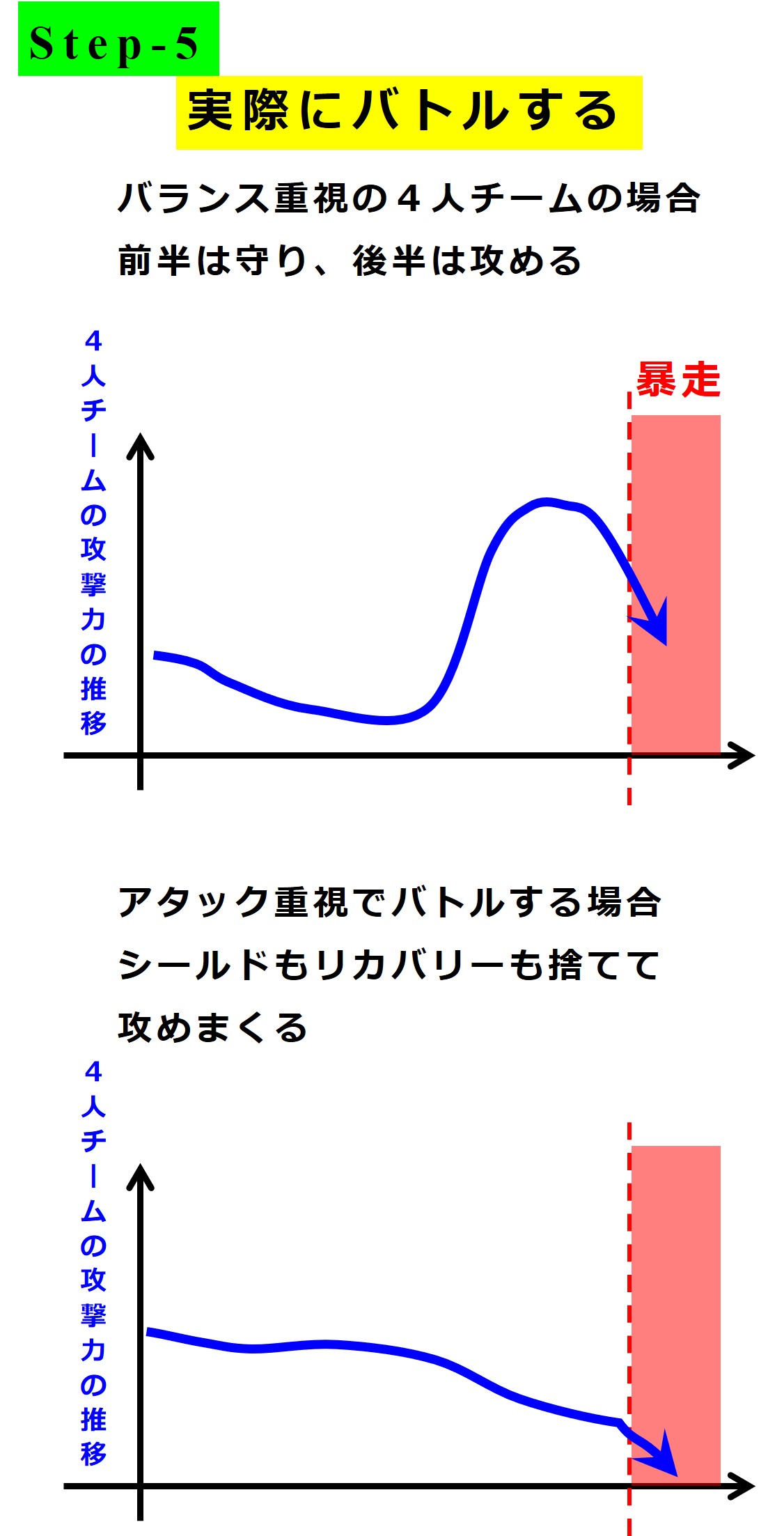 マックス技の強化レベルの低い人によるリカバリーは大きくありません。4人チーム全体で攻撃・防御・回復のバランスを考える必要があります。