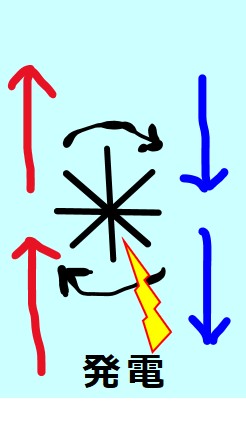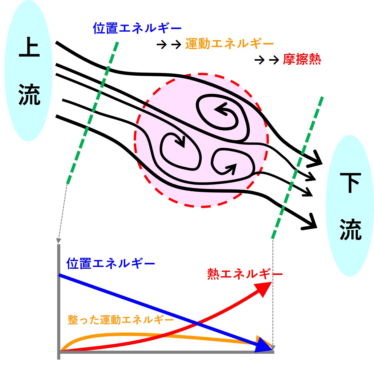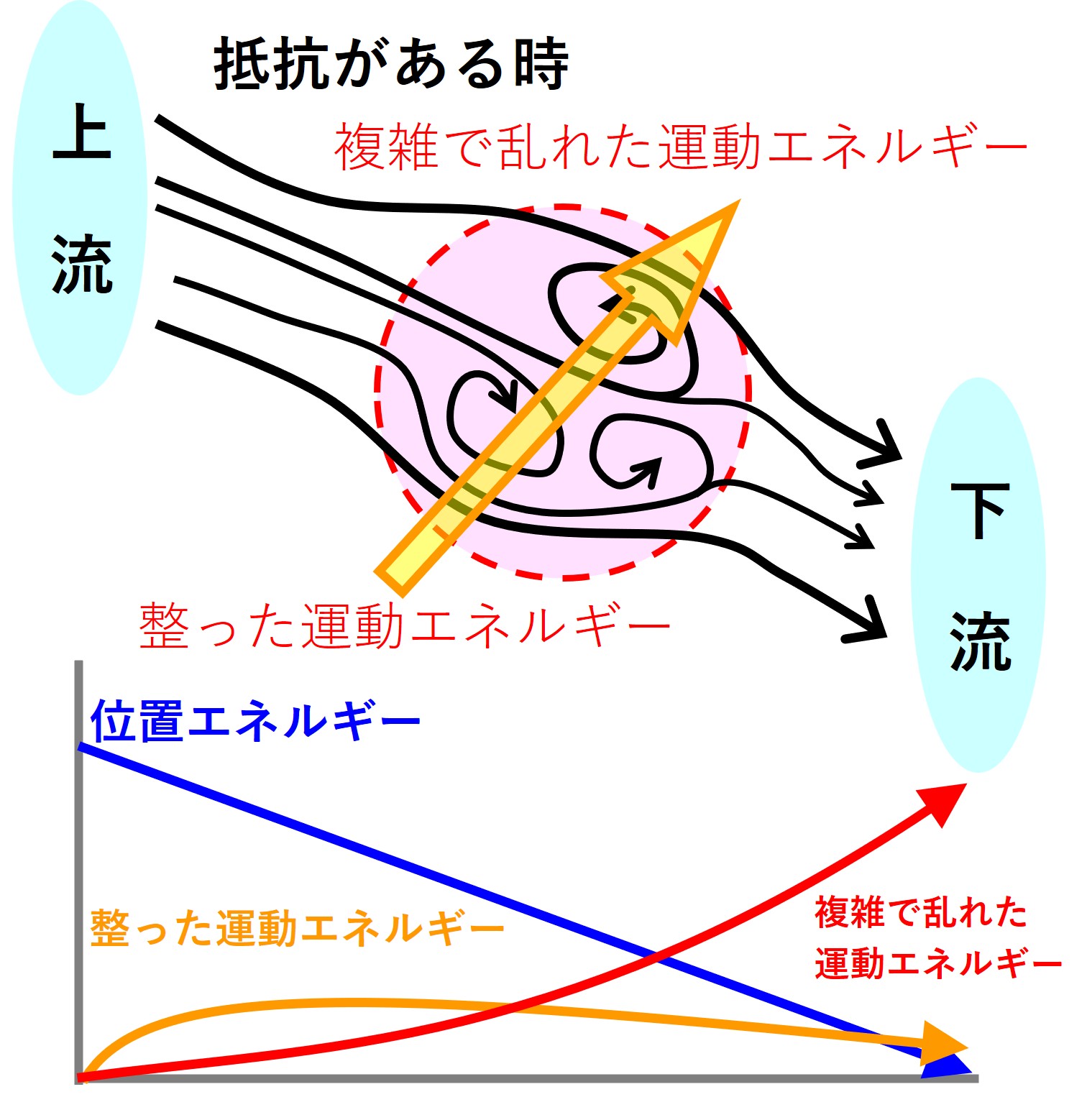 しかし、水の流れに抵抗があると、水流と抵抗との摩擦(まさつ)により「下流へ向かう整った運動エネルギー」の一部は「複雑で乱れた運動エネルギー」に変わります。