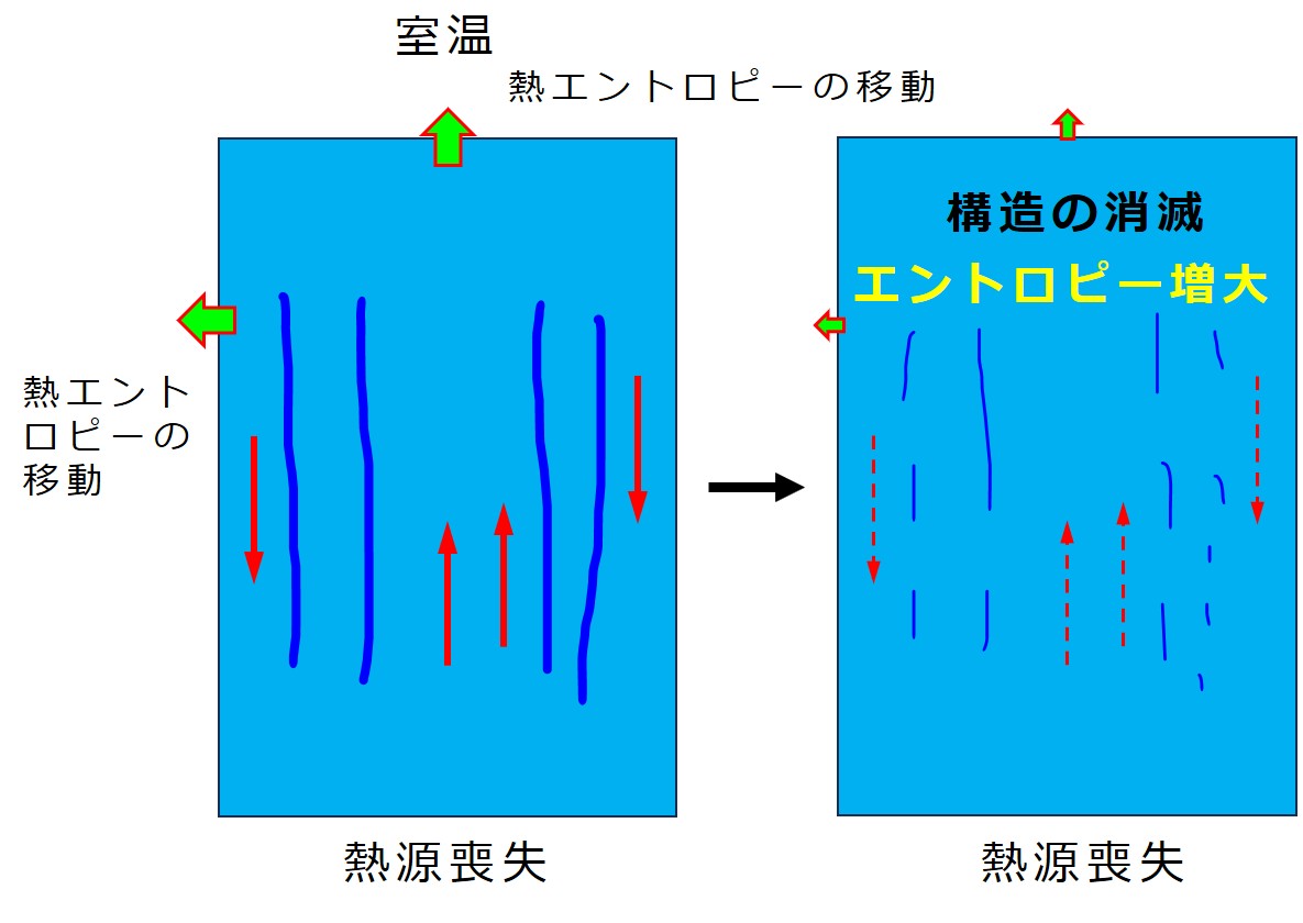 散逸構造の中では、勝手に「多数の極微小で乱雑な運動(熱)」への変化が進み、肉眼的に認められた構造は消えていきます。