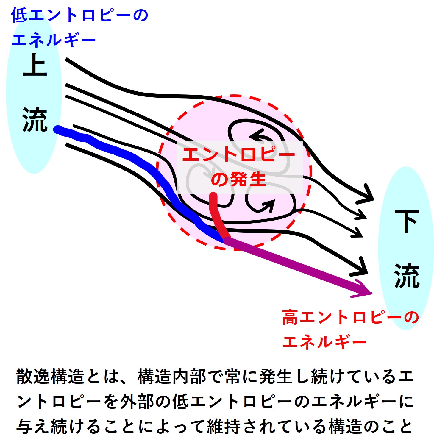 この大きな渦巻の運動をずっと維持するためには、上流から水が常に流れ込むことが必要です(つまり、低エントロピーのエネルギーが構造の中に流れ込み続けることが必要です)。
