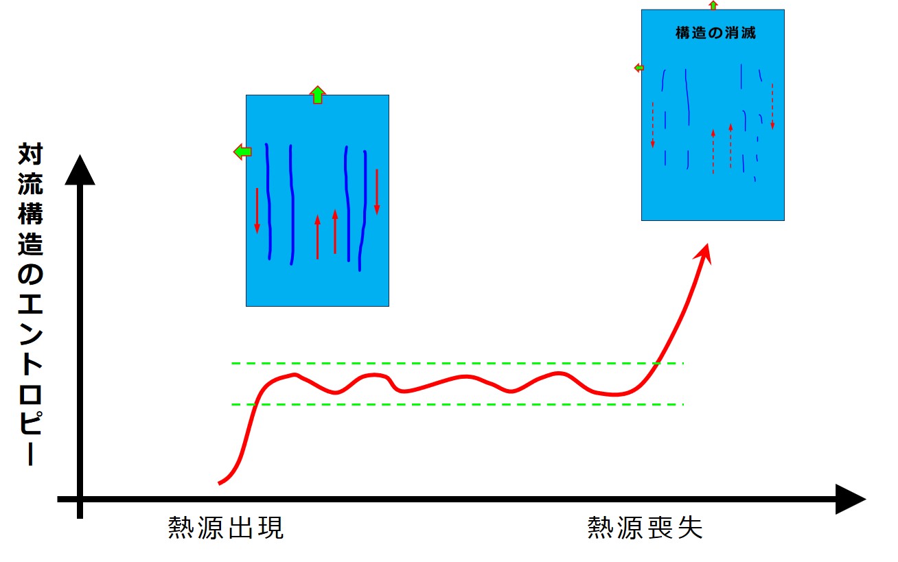 この「流入する低エントロピーのエネルギー」と「高エントロピーのエネルギー」とのバランスで、散逸構造は維持されます(成長したり、消退したりします)。