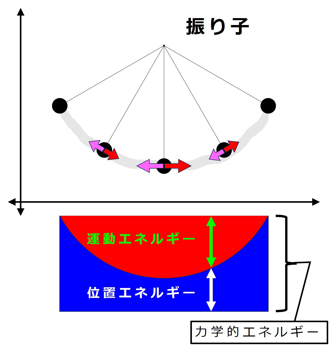 位置エネルギー potential energy 、運動エネルギー kinetic energy って何という方は、振り子運動の図を見て思い出してください。