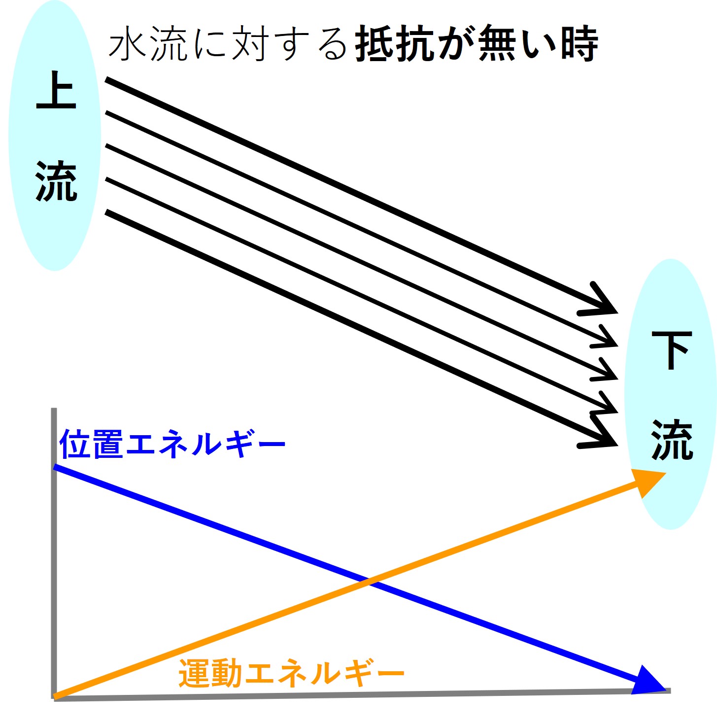 上流で持っていた水の「位置エネルギー」は、すべて水の「運動エネルギー」に変わります。