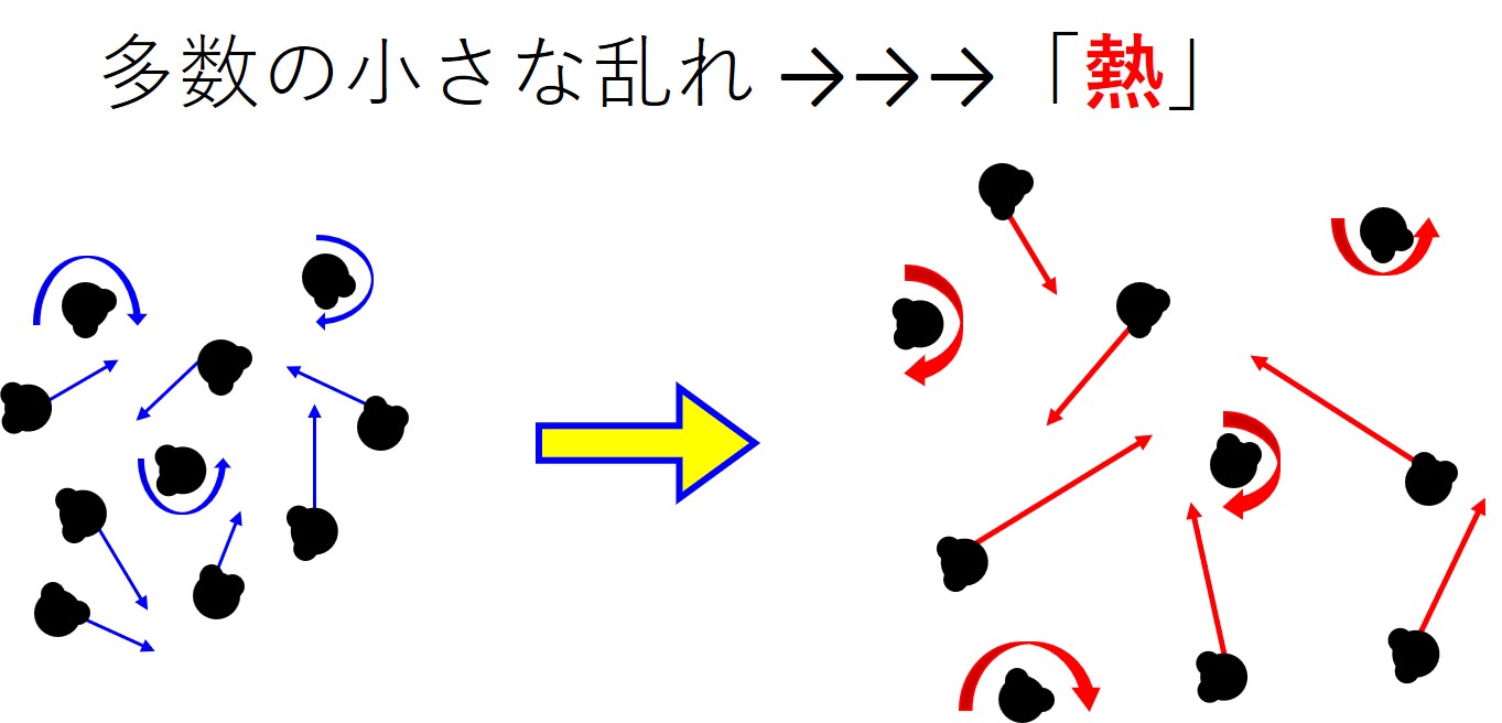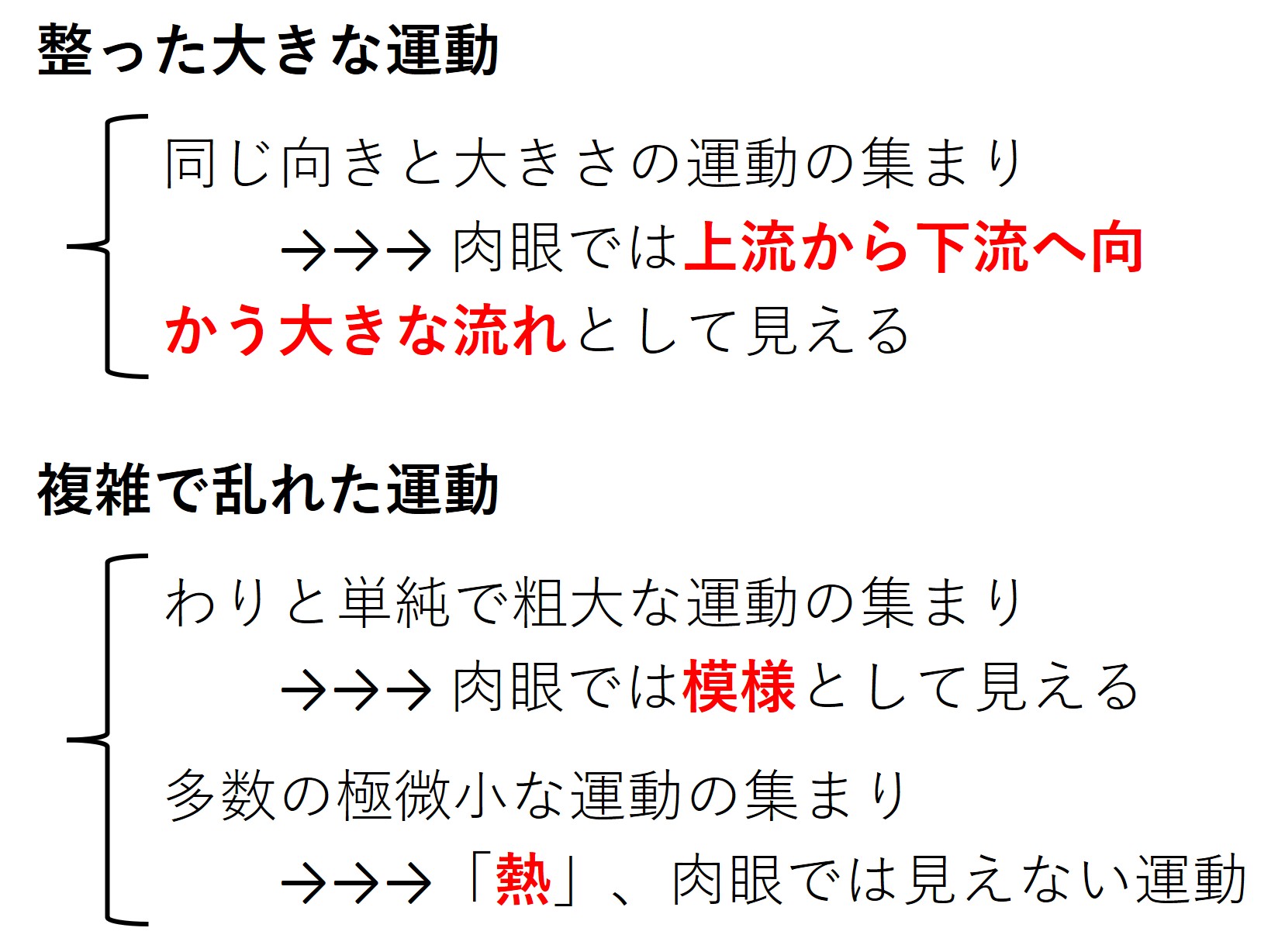 「複雑で乱れた運動エネルギー(乱雑な運動エネルギー)」は、比較的単純で肉眼で観察できるときは「水模様」として粗大な動きを見ることができますが、どんどん分散していくと究極的には「熱エネルギー」になります。