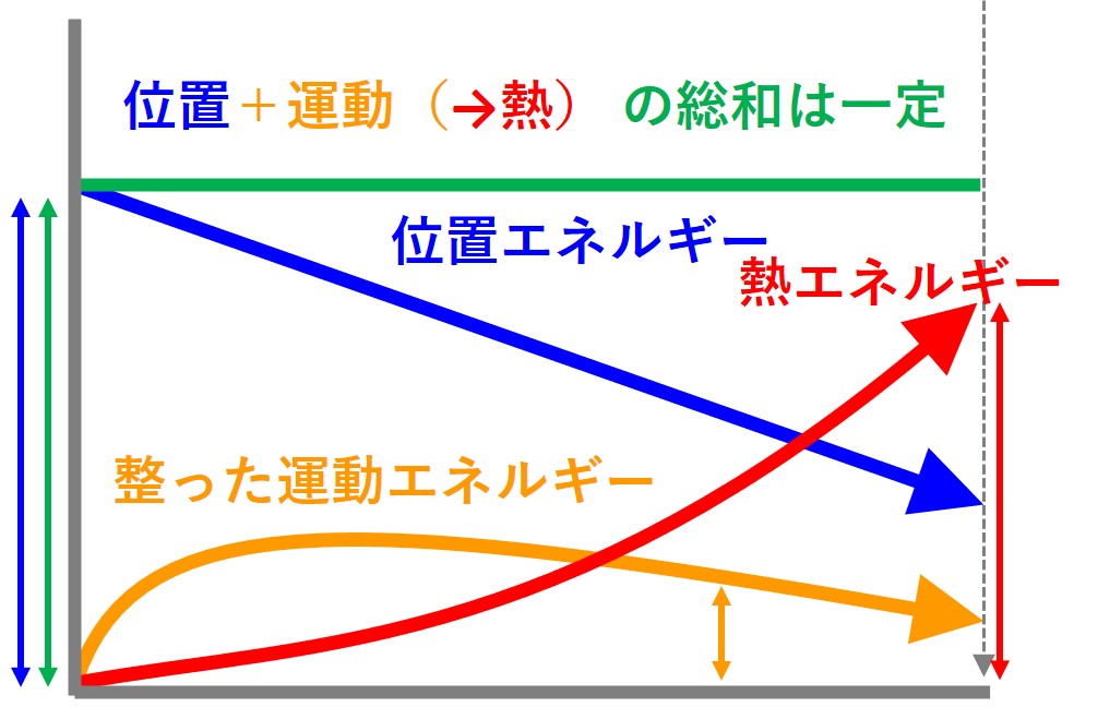高い所で持っていた位置エネルギーは「低エントロピーのエネルギー」です。