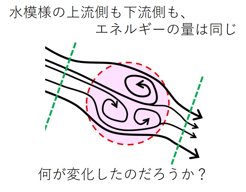 水模様の上流側も下流側も、エネルギーの量的な変化がないとすると、いったい何が変化しているのでしょうか。