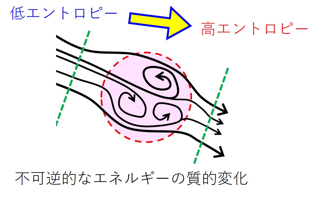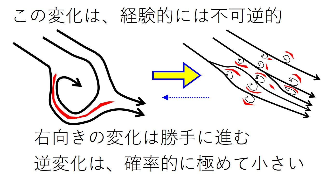 また、この渦の内部では「多数の極微小な複雑で乱雑な運動」へ向かう変化が常に、勝手に起こっています。