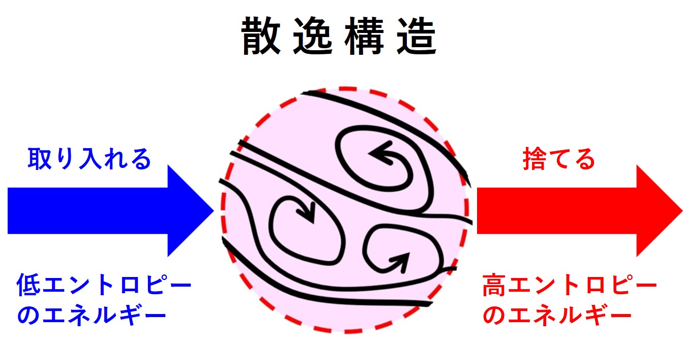 低エントロピーのエネルギーが流れるときの摩擦により「単純で粗大で乱雑な運動(散逸構造)」が生じます。