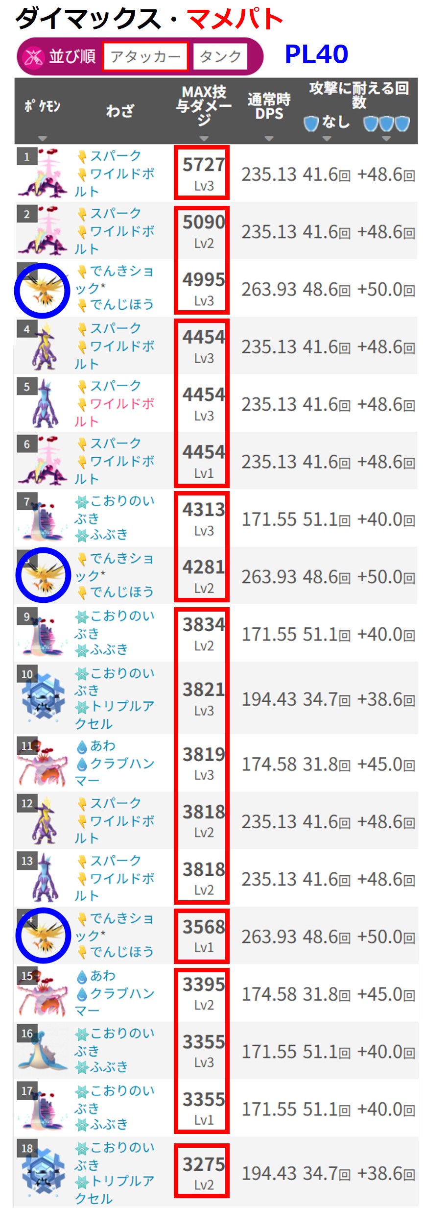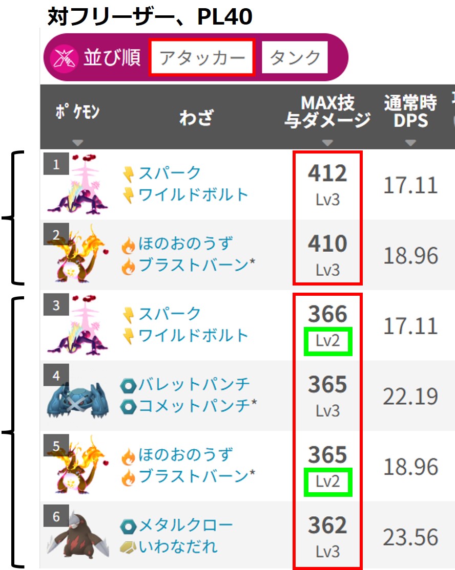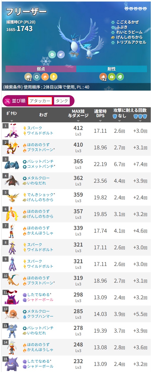 フリーザーに対する攻撃力(アタッカー):PL40、マックスわざ強化レベル3(MAX!)の結果は次のとおりです。