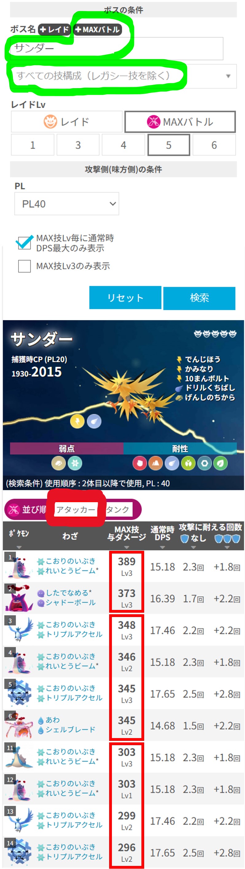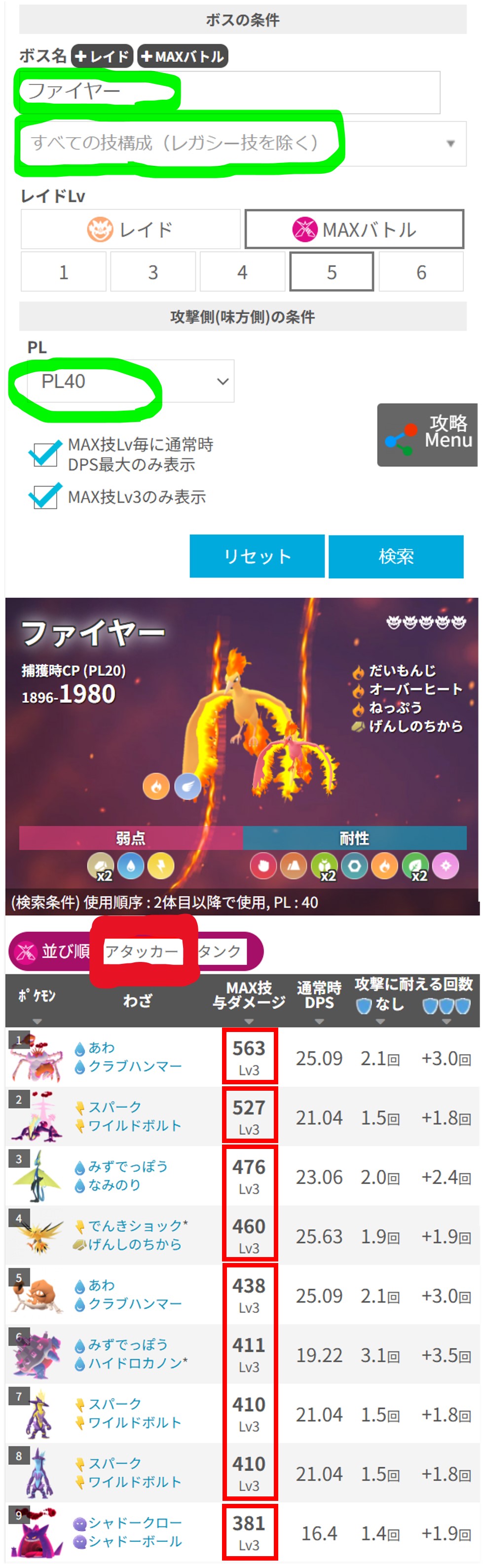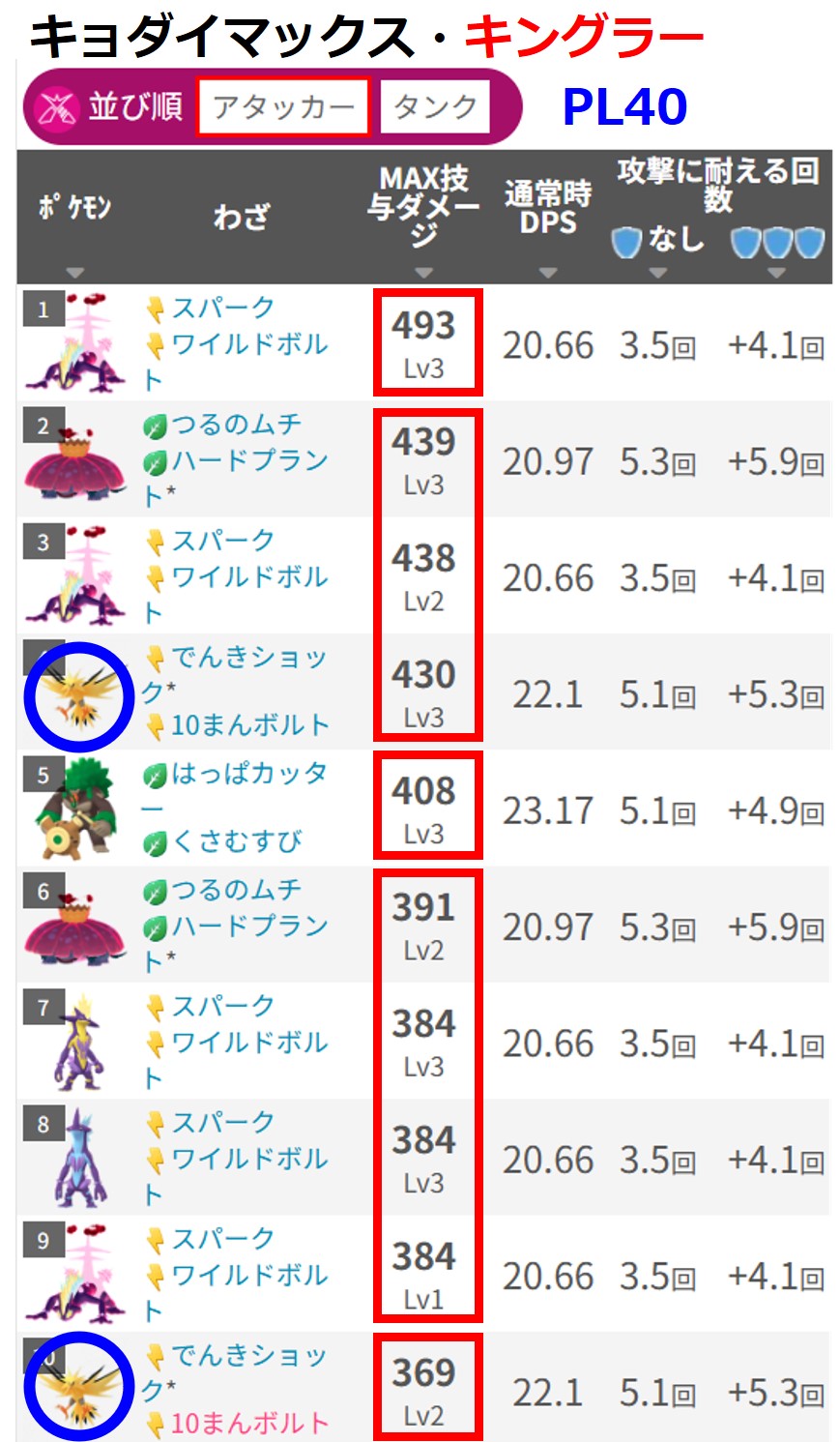 フリーザーに対する攻撃力(アタッカー):PL40、マックスわざ強化レベル3(MAX!)の結果は次のとおりです。