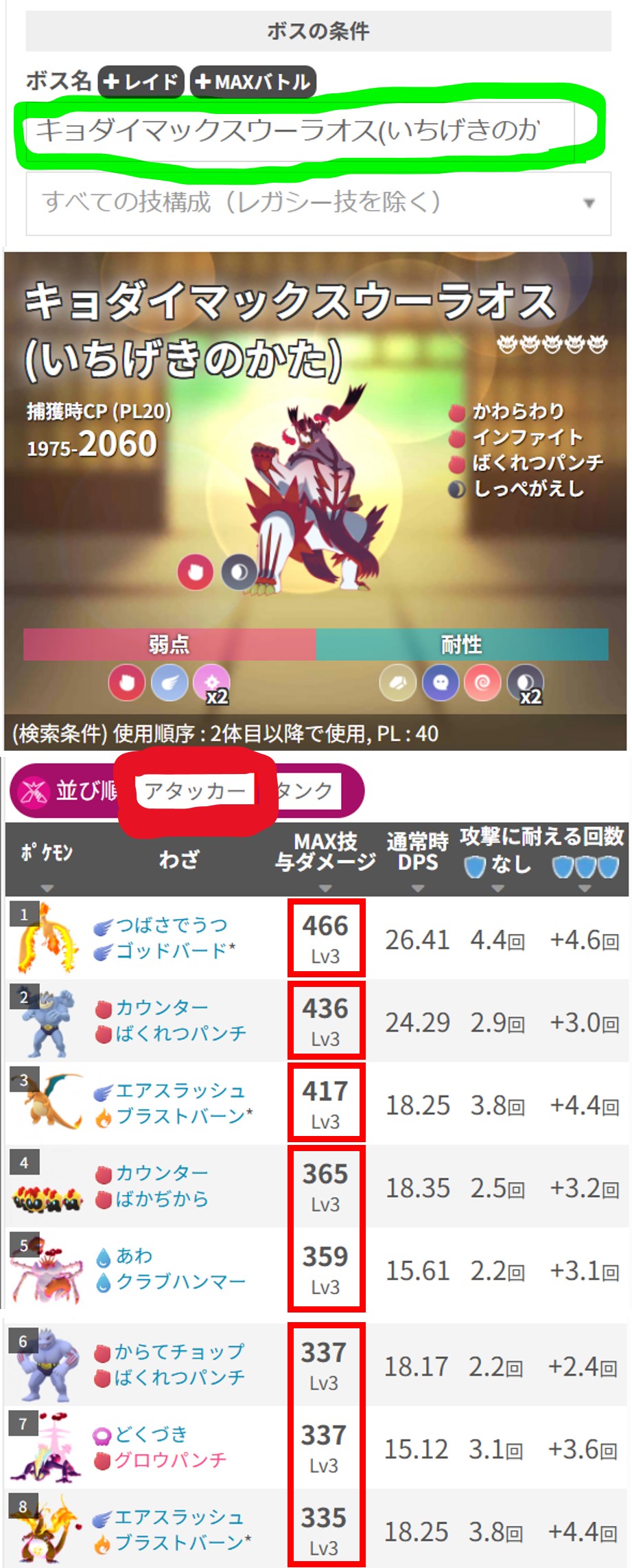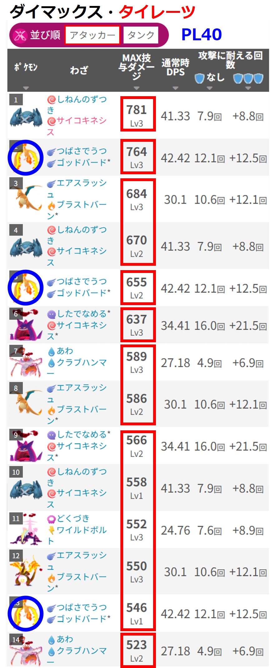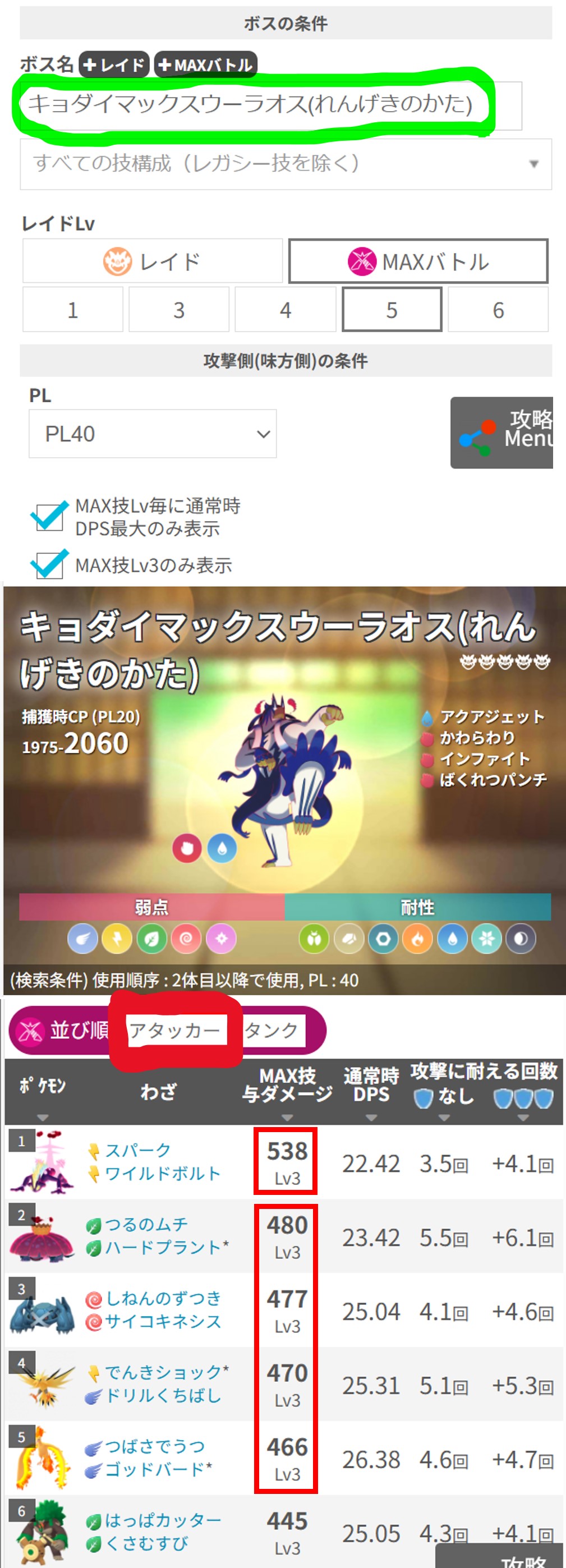 自分が持っているポケモンのPL(ポケモンレベル)毎の MAX技与ダメージ の大きさを調べて、最適のアタッカーを選びましょう。