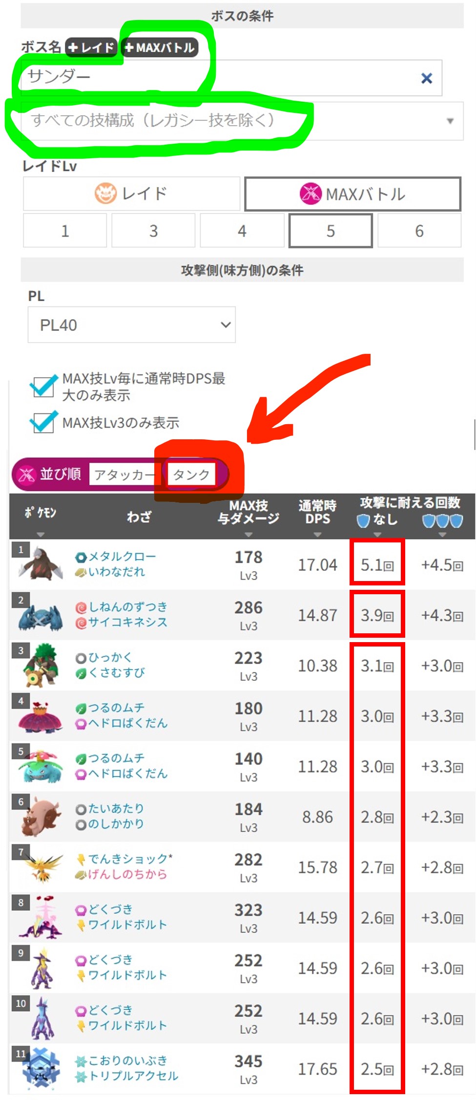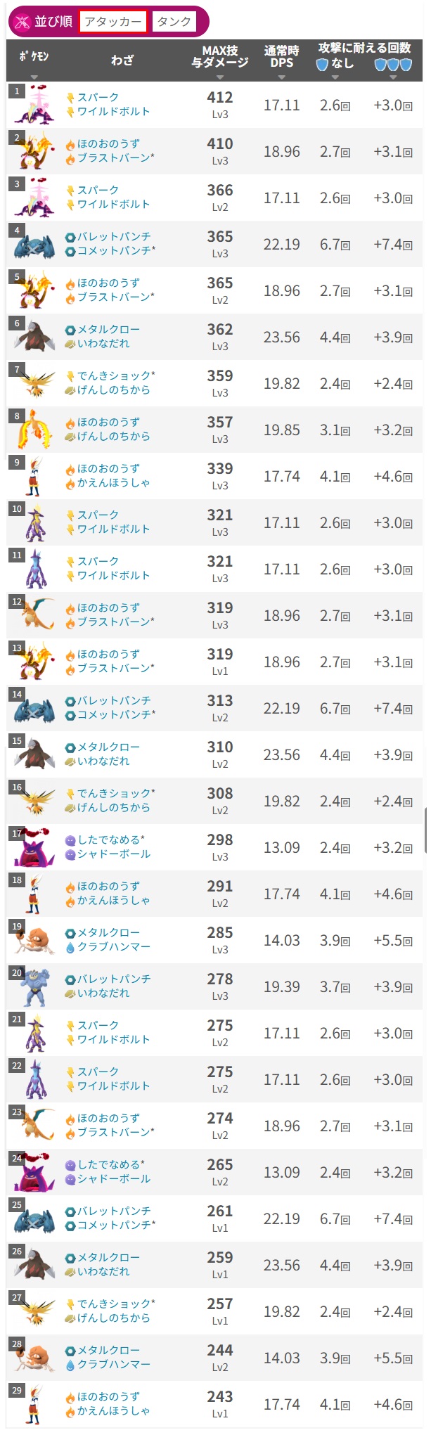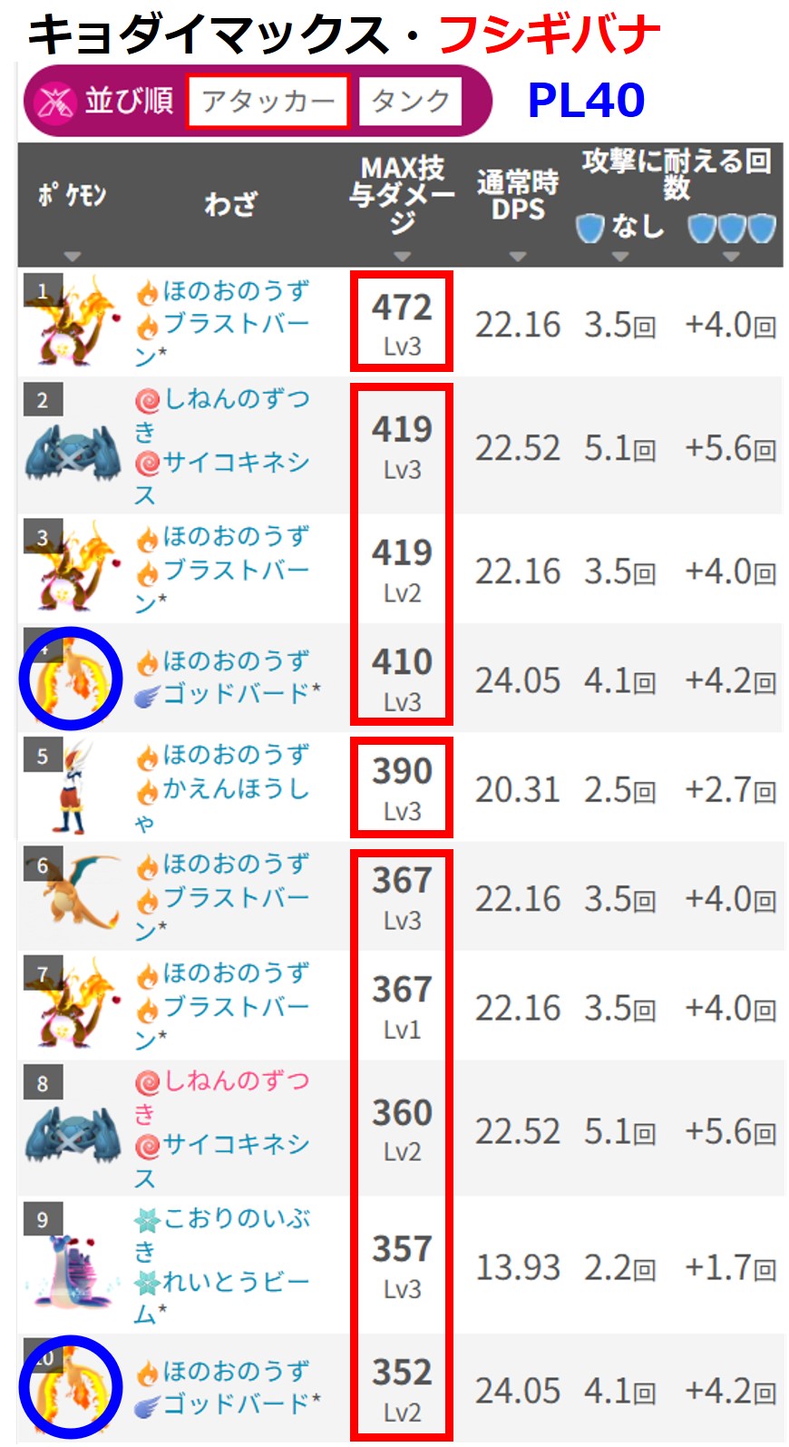 自分が持っているポケモンのPL(ポケモンレベル)毎の MAX技与ダメージ の大きさを調べて、最適のアタッカーを選びましょう。
