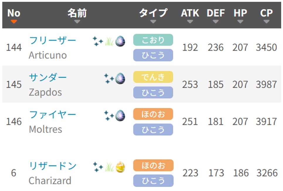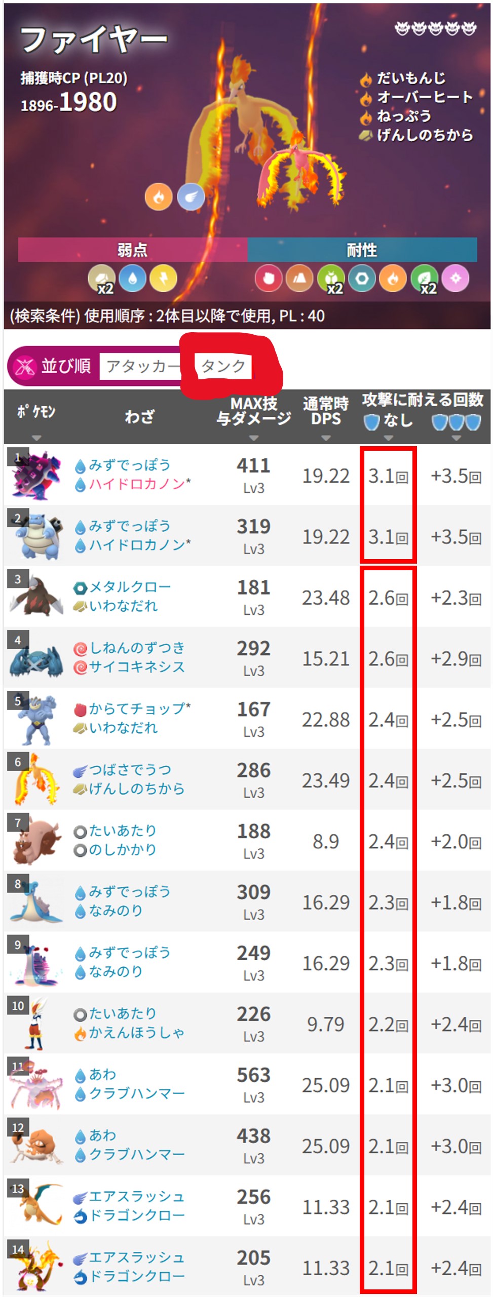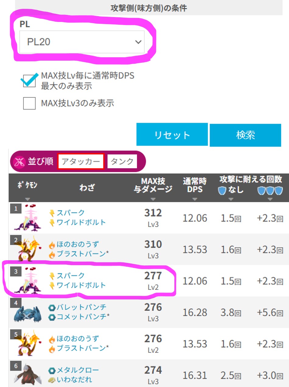 「ポケモンレベル 50 まで強化したゲンガー」と「ポケモンレベル 40 まで強化したリザードン」とで、フリーザーに与えることのできるダメージ量を比較したいというときは、「PL50」での検索結果と「PL40」での検索結果を得て、数値(MAX技与ダメージなど)を比較する必要があります。