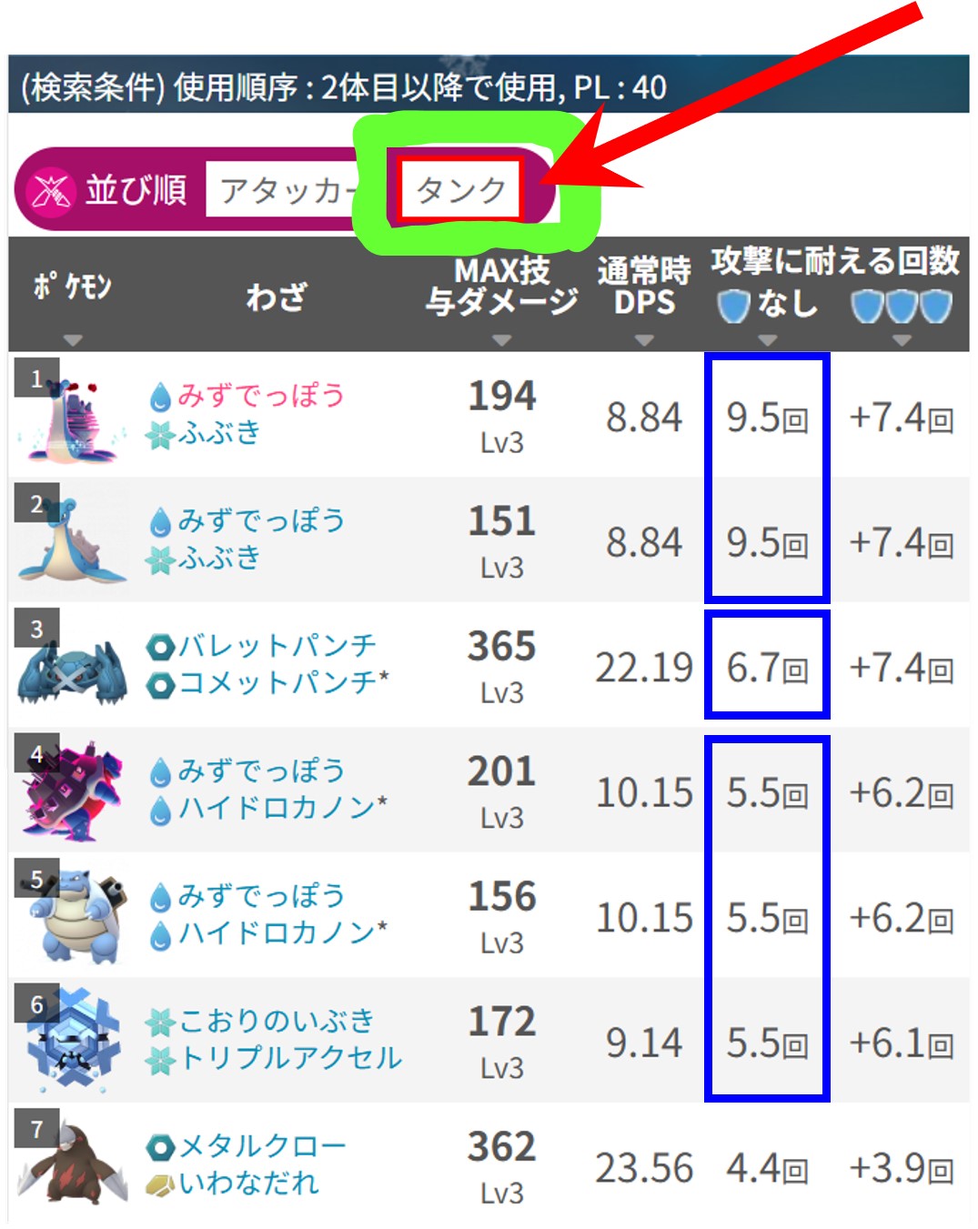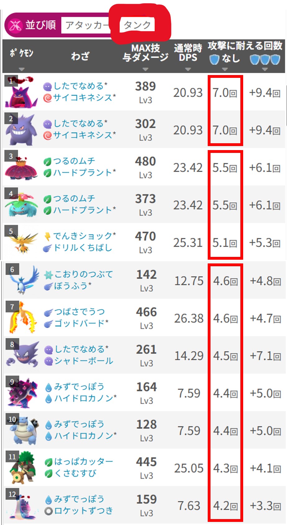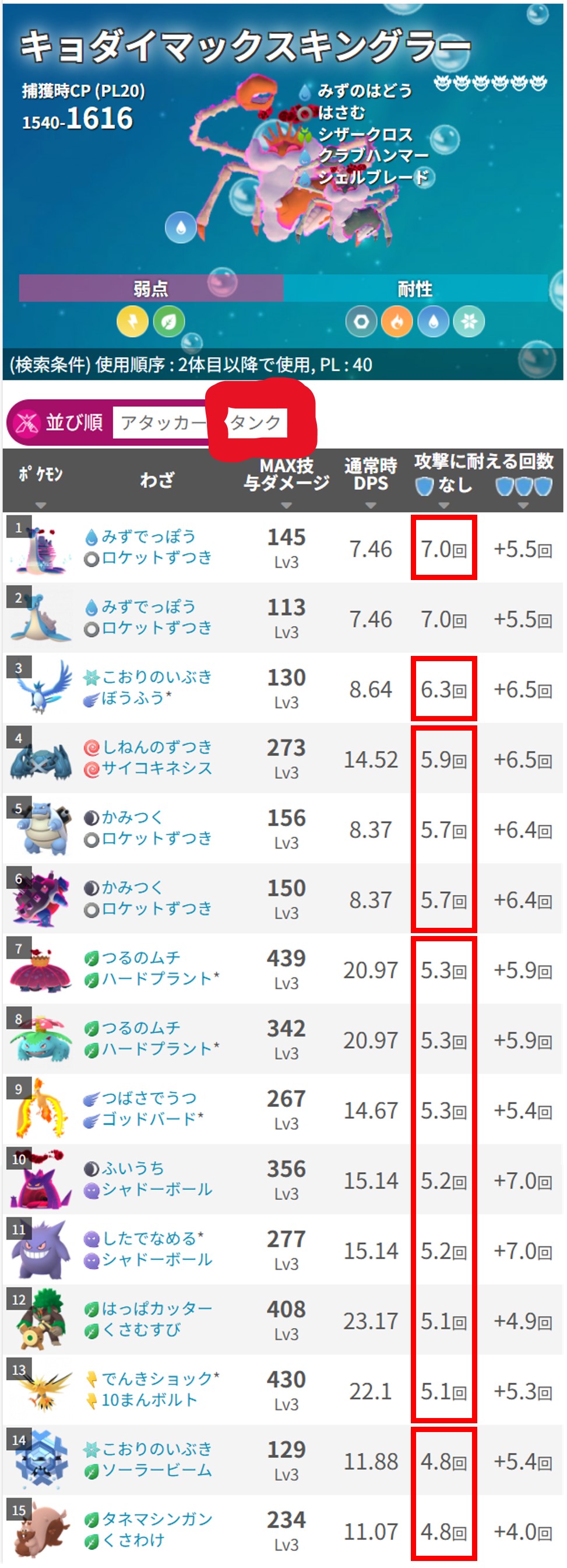 ポケモン強化に使えるアメと砂との相談になりますが、その制約がない場合は「ラプラス(みずでっぽう)」と「カメックス」がタンクとしては優秀のようです。