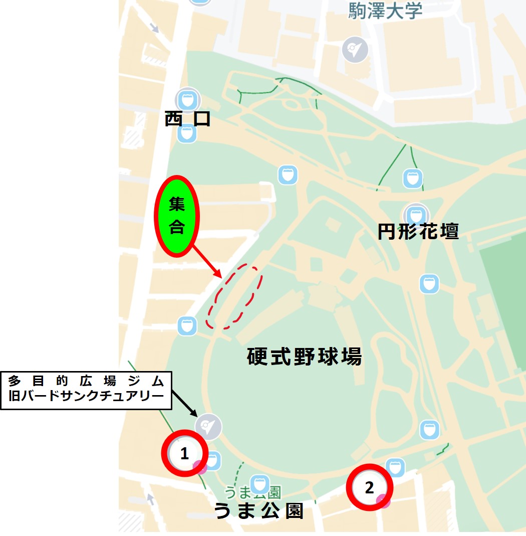 集合場所は「駒沢公園 硬式野球場 西側のベンチのある細長い広場」です。多目的広場という名前のジム(旧バードサンクチュアリージム)の北側です。