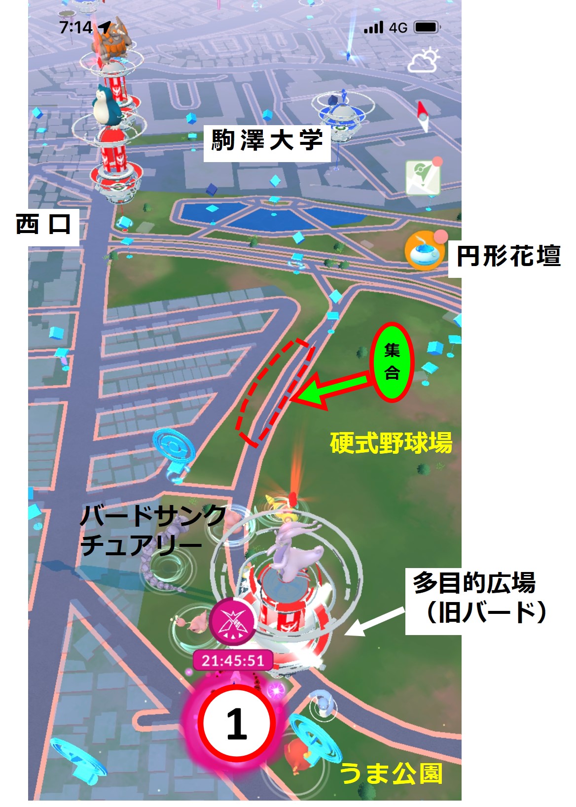 徒歩参加者がいない場合、人数が減り、ダイキノコを使いはじめる可能性もあるので、⑤ → ⑥ → ⑦ と公園から遠く離れないで自転車移動する予定です。