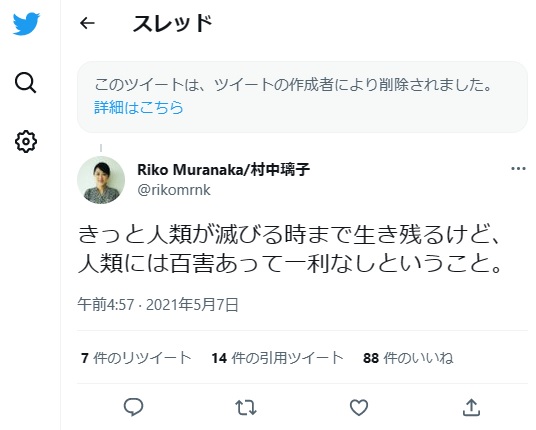 村中璃子さん(ペンネーム)は、3回目接種後コロナにかかり、4回目接種を拒否してゴキブリの仲間入りをされたようです。