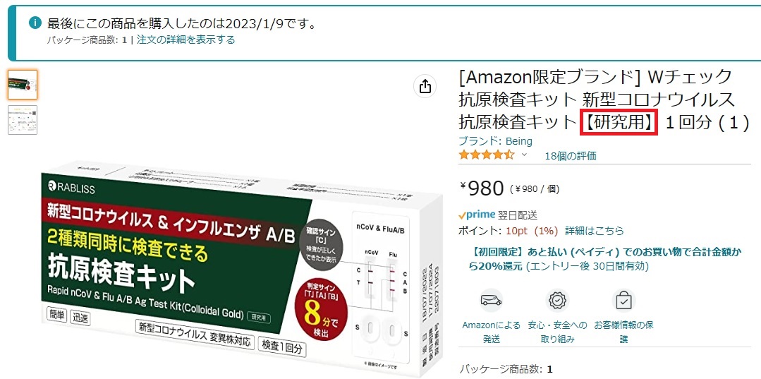 通販のアマゾンで、コロナとインフルエンザのダブルチェック用抗原検査キットを発注しました。キットの到着が1月9日当日中のものを探すと「医療用」の検査キットはありませんでした。