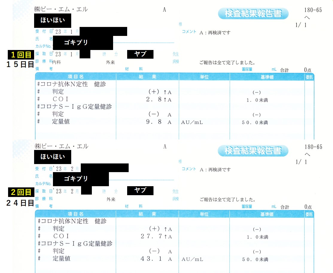 | 1月23日 | 血液検査1回目(発症15日後)コロナ抗体検査 | ||