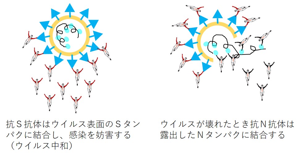 短期的に見た場合、感染防止に最も役立つのは スパイク に対する抗体(抗S抗体)です。 ウイルス粒子の内部に存在する ヌクレオカプシド に対する抗体(抗N抗体)は感染防止には役立ちません。・・・・「短期的に」というのが味噌ですが。