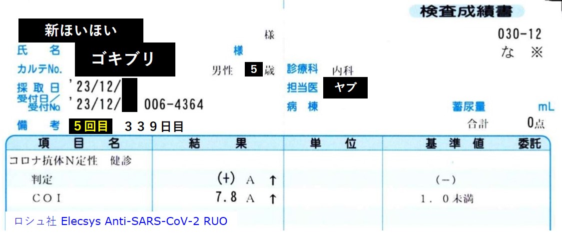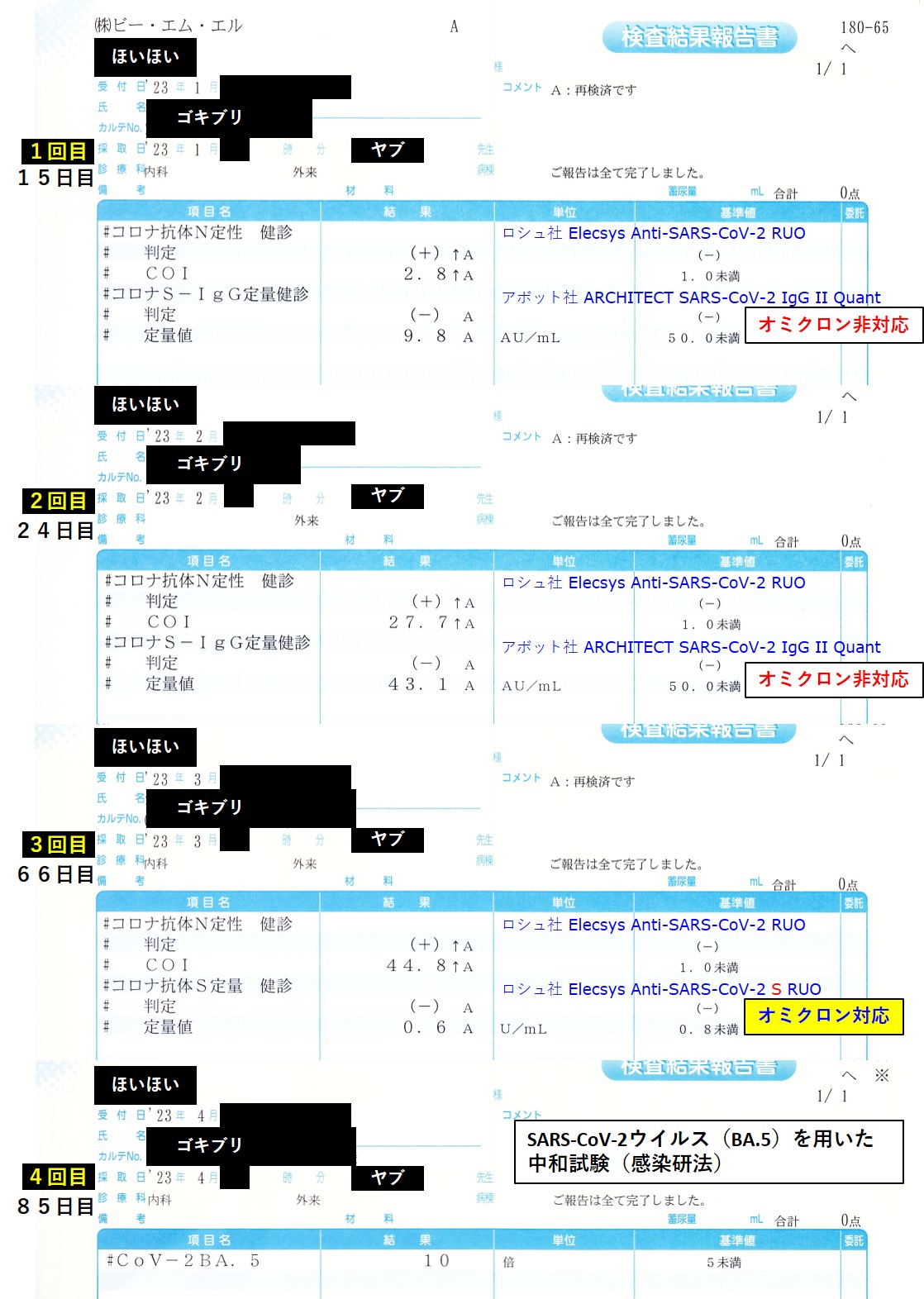 私は「役立たない抗N:陽性、役立つ抗S:陰性」という奇妙な検査結果に納得できなかったのですが、計5回ゴキブリの採血検査を行い、最終的に 正しい検査結果! であると認めることにしました。