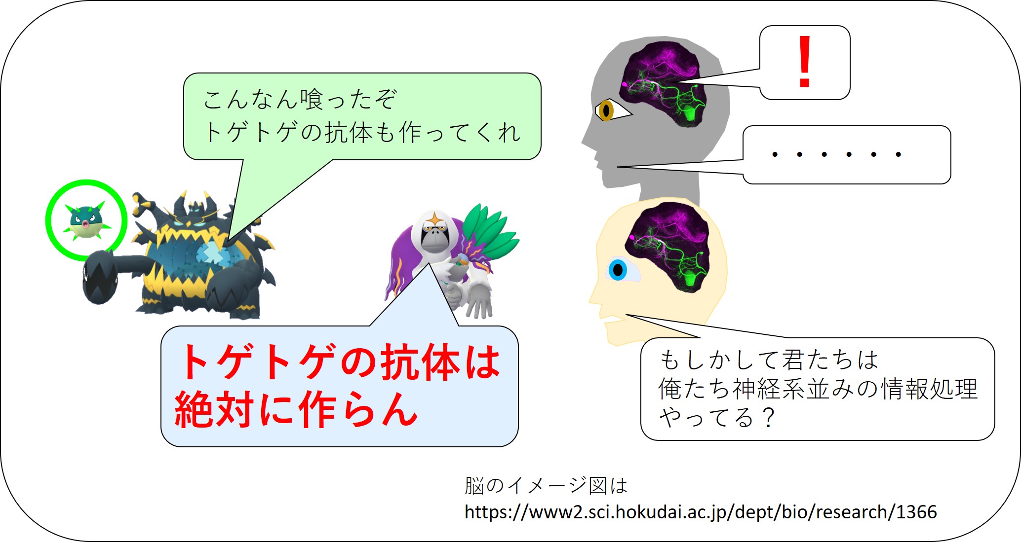 免疫系と神経系の協力関係を考えると、病原体に対して、免疫系が神経系の「より高度な助けを借りて(つまり文明の力を借りて)」、人工的な手段での対応(たとえばワクチン接種)をすることも、わりと自然な選択肢のひとつだと考えられます。