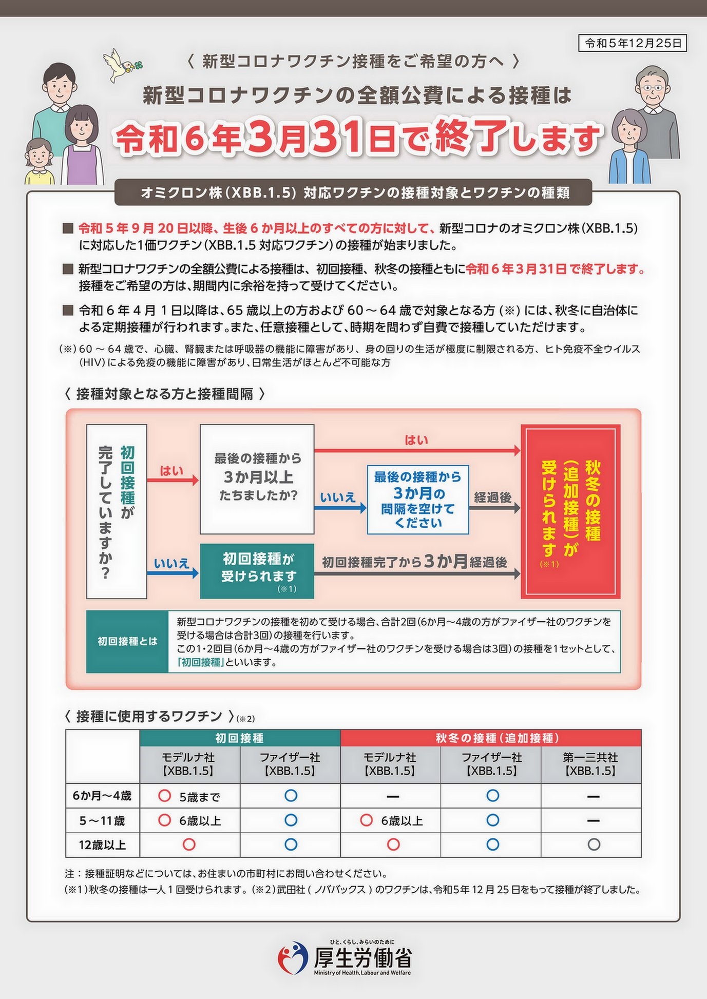 新型コロナウイルスの感染に、引き続き十分な注意をお願いいたします。生後6か月以上の全ての方にXBB.1.5対応ワクチンの接種を受けていただくことができます。