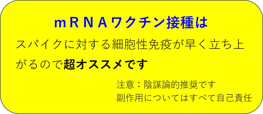 mRNAワクチン接種を一度も受けたことがなく(受けるつもりもなく)、感染したこともないという方は、ウイルスに対する細胞性免疫が強化されていませんから、決して油断しないで、感染しないように気をつけて下さい。