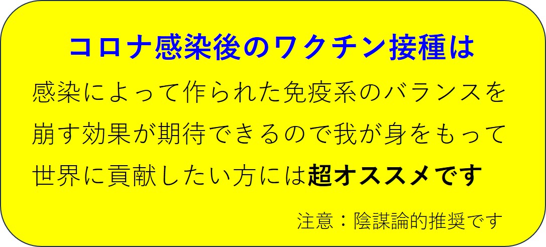 コロナに対しても生ワクチンが優れているというのは、ごく普通の教科書的な結論ですが、それがいまだに始まらないのは、陰謀論的に言えば、闇世界の支配者によって生ワクチンの研究開発が禁止されているということでしょう。