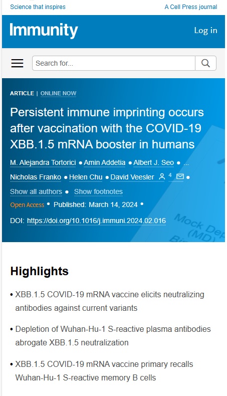 ◆ Persistent immune imprinting occurs after vaccination with the COVID-19 XBB.1.5 mRNA booster in humans (March 14, 2024):▶ ▶ ▶