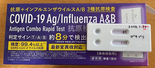 事前に購入していた検査キット:【Being】【2023新型 変異株対応 オミクロンXBB BA.2 BA.5 対応】コロナ&インフルエンザ A/B 抗原検査キット 抗原検査キット 新型コロナウイルス 変異種対応 (研究用) 約8分 鼻腔(研究用) ASIN:B0BHSSGTG4