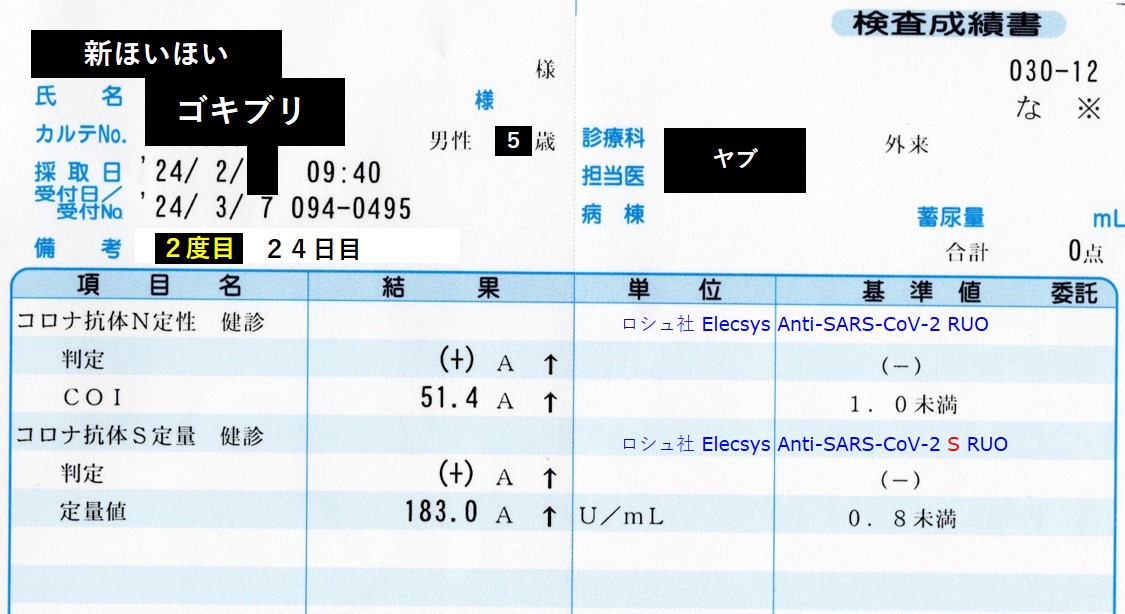 抗体の検査結果が遅いことに気づき、オーダーを確認したところ2月21日(水曜)採血の抗体検査が始まっていませんでした(3月7日に判明)。幸いなことに 2024.02.21(発症後24日目)の保存血清を用いて抗体検査を受けることができました。